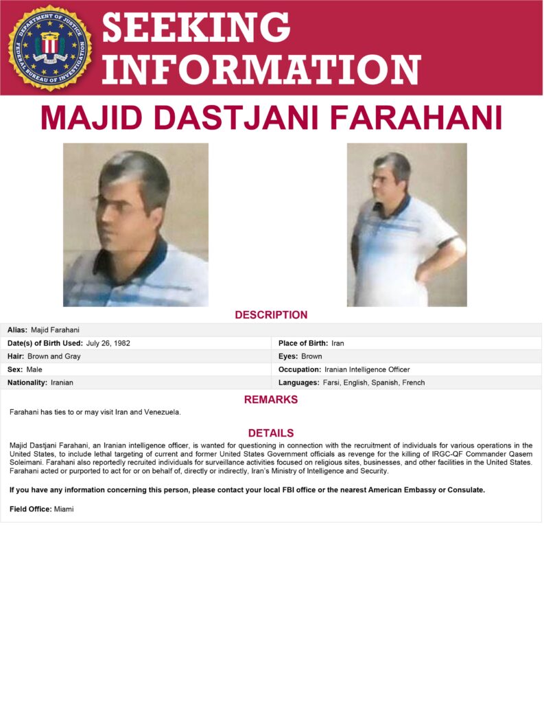 The FBI has issued an alert for Majid Dastjani Farahani, a 41-year-old suspected member of Iran’s Ministry of Intelligence and Security, who is accused of plotting to assassinate former Secretary of State Mike Pompeo and other American officials. Farahani, who speaks multiple languages and frequently travels between Iran and Venezuela, had been recruiting individuals for operations in the US, including lethal targeting of current and former US government officials.
