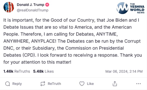 “It is important, for the Good of our Country, that Joe Biden and I Debate Issues that are so vital to America, and the American People,” Trump wrote on Truth Social. “Therefore, I am calling for Debates, ANYTIME, ANYWHERE, ANYPLACE! The Debates can be run by the Corrupt DNC, or their Subsidiary, the Commission on Presidential Debates (CPD). I look forward to receiving a response. Thank you for your attention to this matter!”