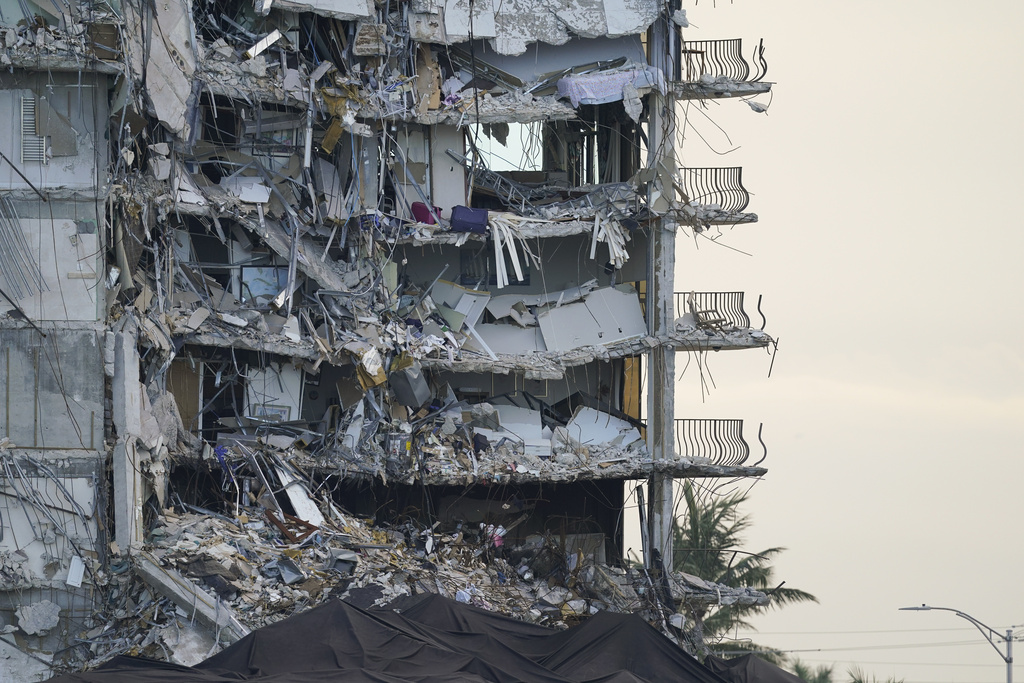 The concrete pool deck was attached to the building, and investigators believe its failure likely damaged and destabilized the base of a support beam that ran through the tower section that first fell. When that beam failed, that caused that tower section to pancake down and a neighboring section to then fall onto it, they said.