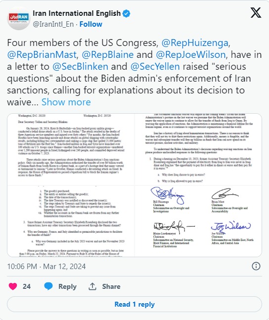 “By waiving the application of sanctions, the Administration is maintaining a financial lifeline for the Iranian regime, even as it continues to support terrorist organizations around the world,” Rep. Bill Huizenga (Mich.) and three GOP House colleagues wrote to the Biden administration earlier this week.