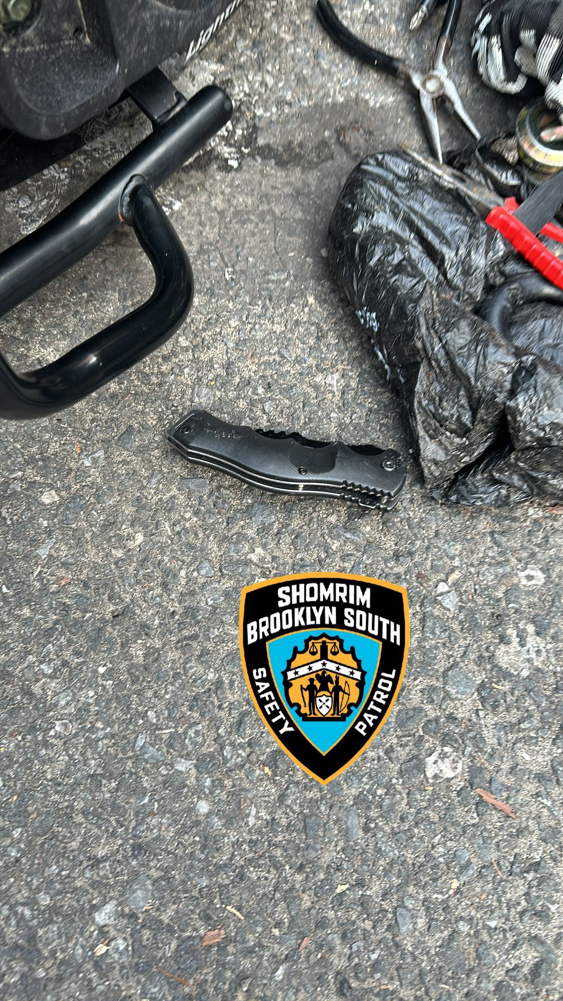 At some point, the gang managed to break the lock securing the motorcycle, but the owner just then arrived at the scene and confronted the thieves. One of them then pulled out a machete-style knife, at which point Shomrim members moved in.