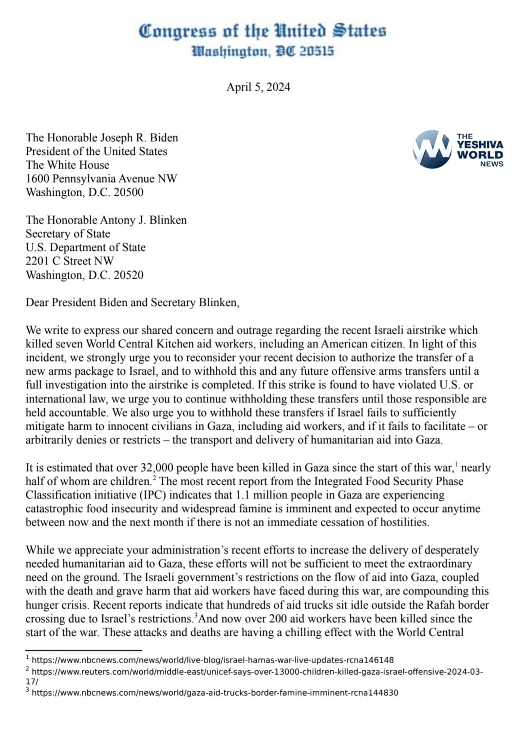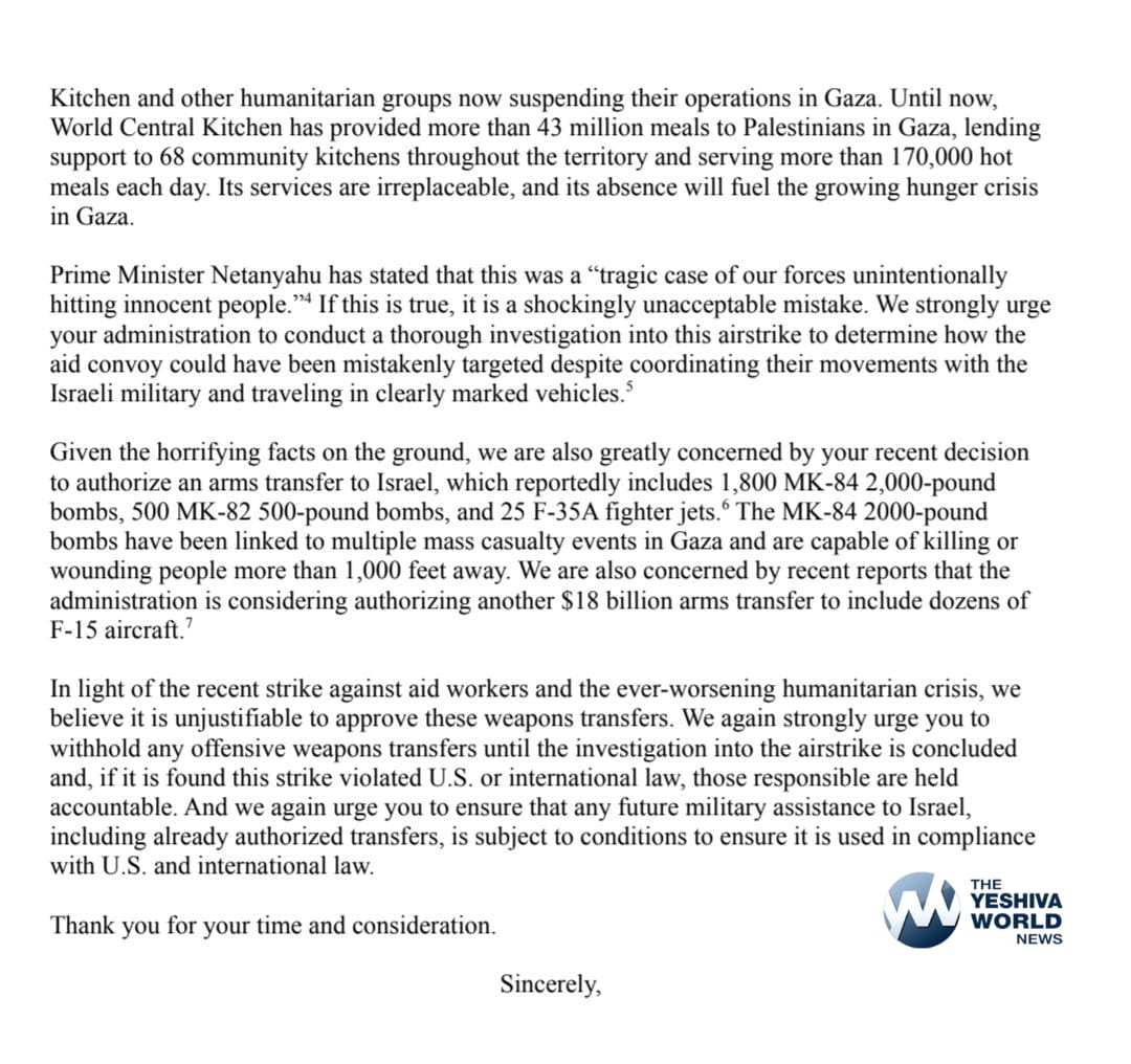 The lawmakers wrote, “We strongly urge you to reconsider your recent decision to authorize the transfer of a new arms package to Israel, and to withhold this and any future offensive arms transfers until a full investigation into the airstrike is completed.”