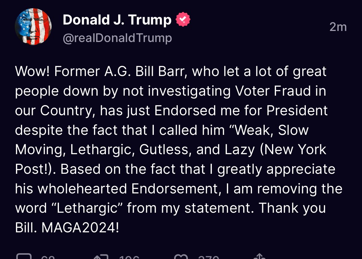 Wow! Former A.G. Bill Barr, who let a lot of great people down by not investigating Voter Fraud in our Country, has just Endorsed me for President despite the fact that I called him “Weak, Slow Moving, Lethargic, Gutless, and Lazy” (New York Post!). Based on the fact that I greatly appreciate his wholehearted Endorsement, I am removing the word “Lethargic” from my statement. Thank you Bill. MAGA2024!