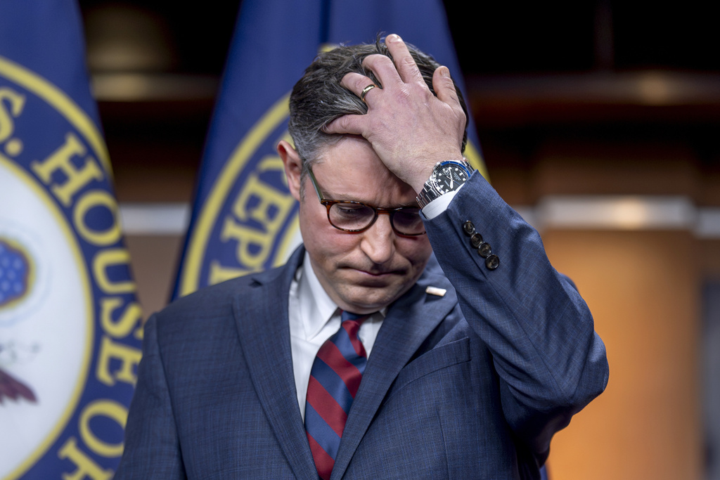 Speaker of the House Mike Johnson, R-La., pauses during a news conference amid threats that Rep. Marjorie Taylor Greene, R-Ga., a staunch ally of former President Donald Trump, is threatening to oust Johnson from his leadership post, at the Capitol in Washington, Tuesday, May 7, 2024. (AP Photo/J. Scott Applewhite)