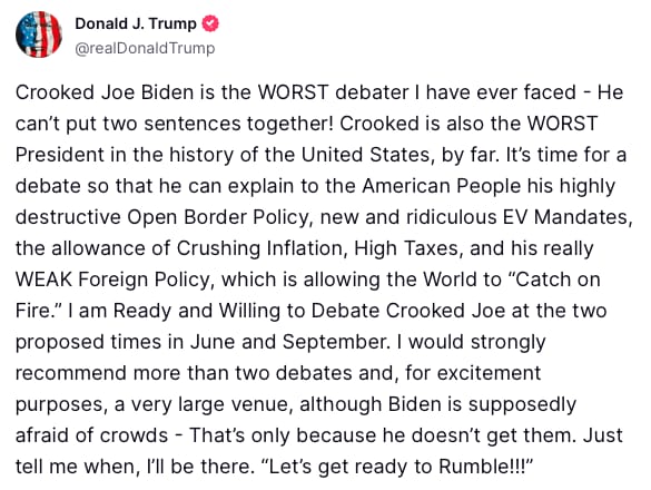 Shortly after Biden’s message, Trump responded on his TRUTH Social account, that he is accepting the proposal for debates: