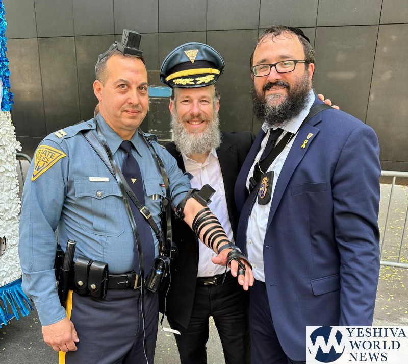 At least two of the Jews approached by Rabbi Carlebach were New Jersey State Troopers. Fully clad in the NJSP uniform, Rabbi Carlebach put yarmulkas on their heads, wrapped tefillin on them, and made the brachos – a beautiful example of public kiddush sheim shamayim.
