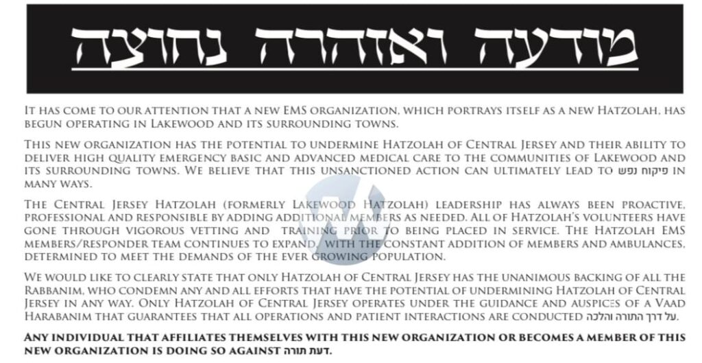 It has come to our attention that a new EMS organization, which portrays itself as a new Hatzolah, has begun operating in Lakewood and its surrounding towns. This new organization has the potential to undermine Hatzolah of Central Jersey and their ability to deliver high quality emergency basic and advanced medical care to the communities of Lakewood and its surrounding towns. We believe that this unsanctioned action can ultimately lead to Pikuach Nefashos in many ways.