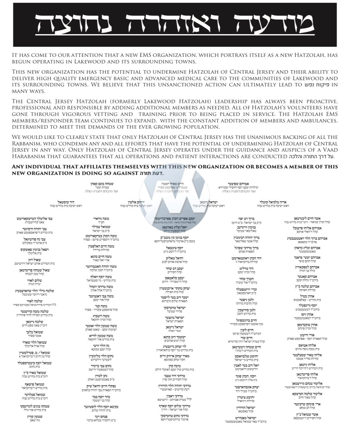 We would like to clearly state that only Hatzolah of Central Jersey has the unanimous backing of all the Rabbanim, who condemn any and all efforts that have the potential of undermining Hatzolah of Central Jersey in any way. Only Hatzolah of Central Jersey operates under the guidance and auspices of a Vaad Harabanim that guarantees that all operations and patient interactions are conducted al derech hatorah v’halacha.