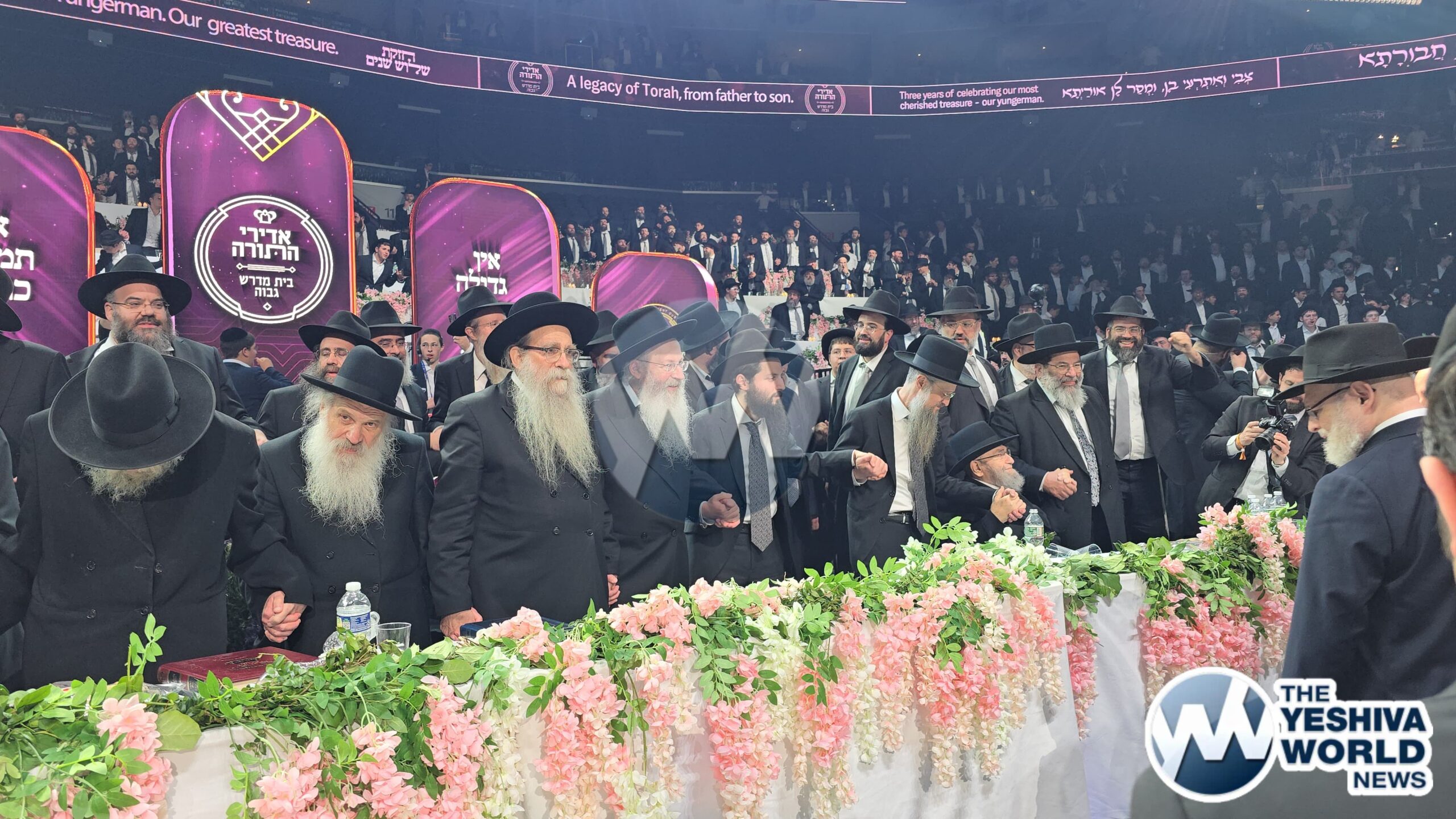 Rav Shmuel Kamenetzky on the Adirei Hatorah dais as the crowd engages in a hartzige niggun
