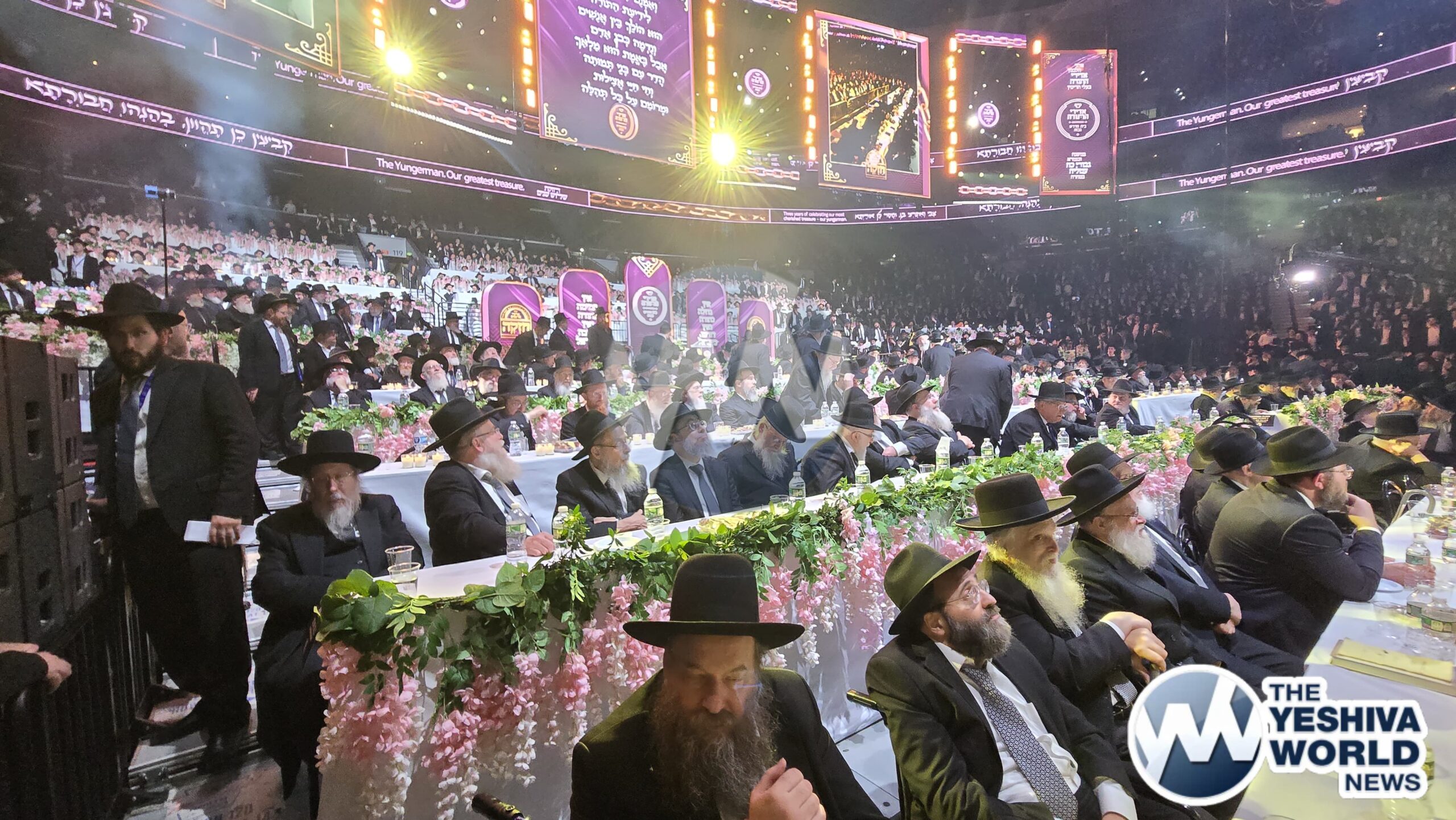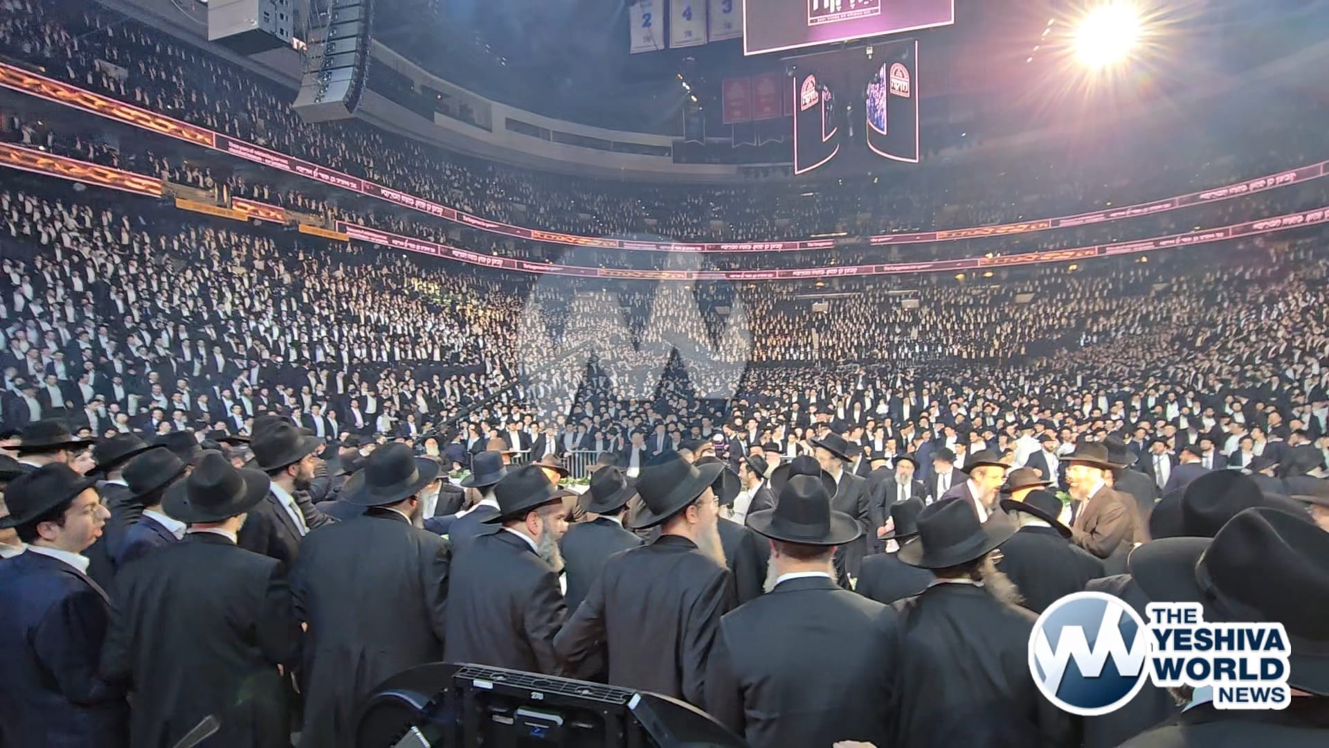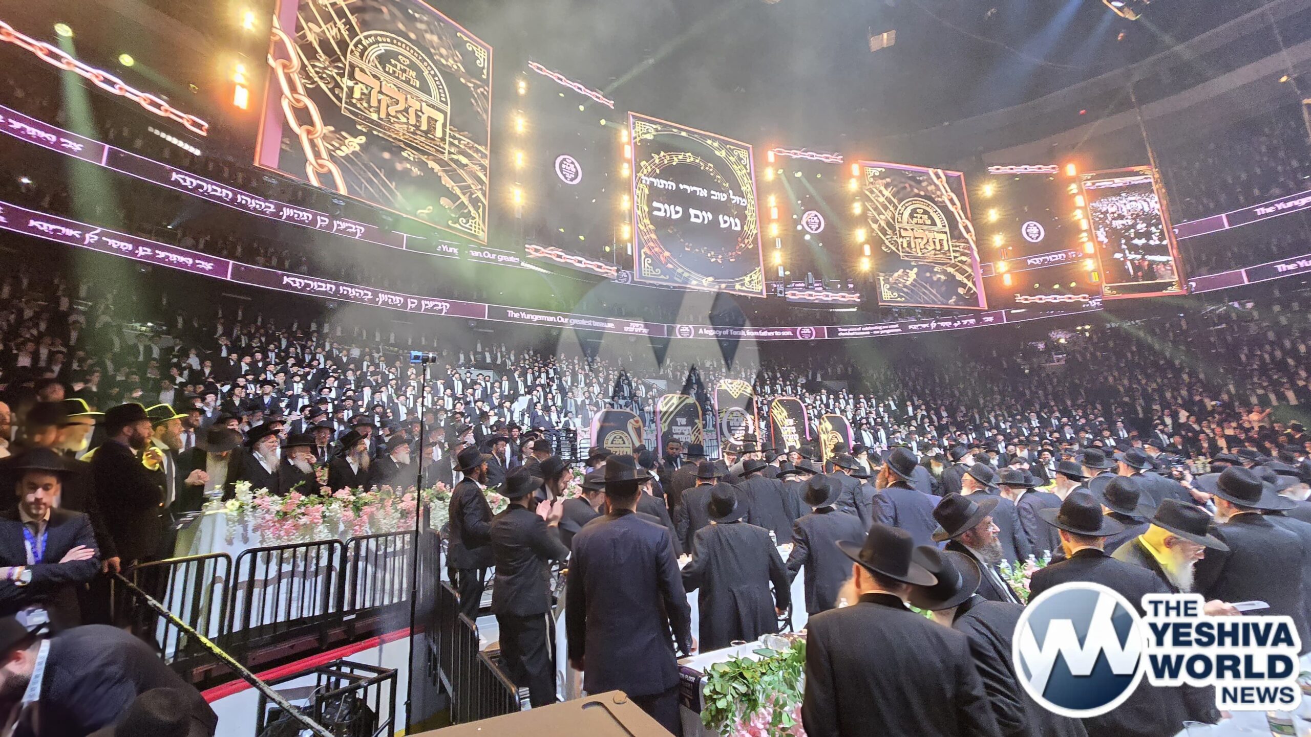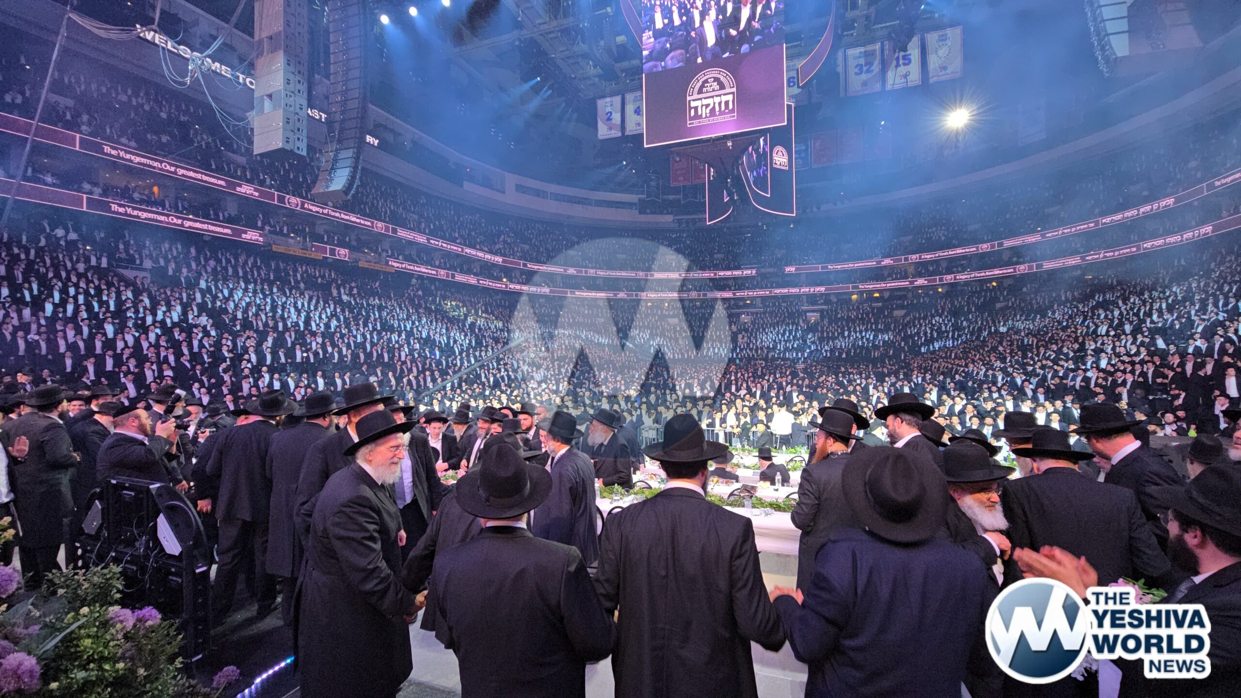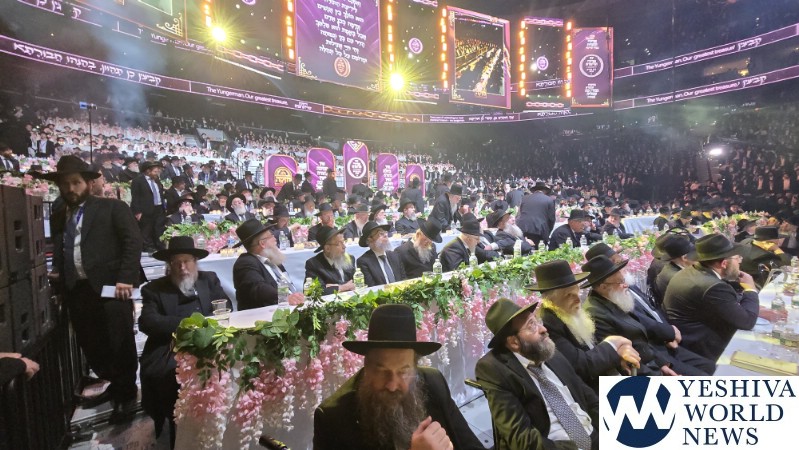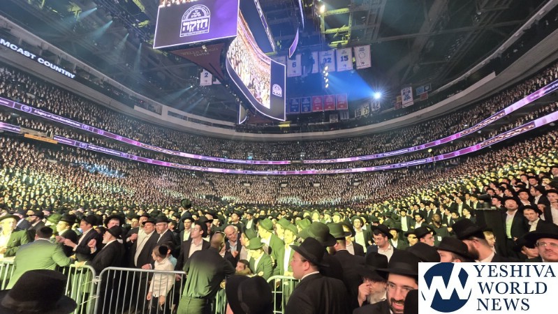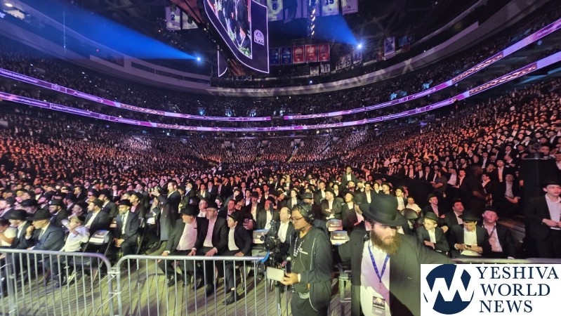 The 20,000+ in attendance welcoming Harav Moshe Hillel Hirsch shlit”a, who flew in from Eretz Yisroel to address the maamad
