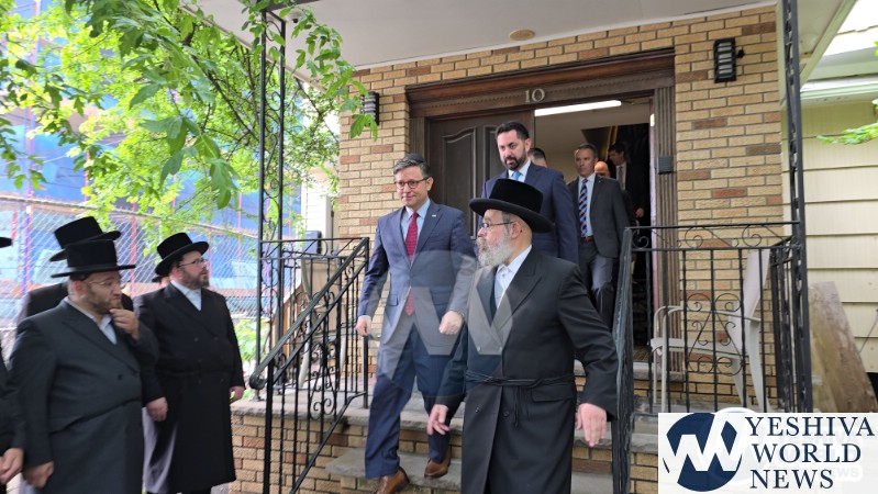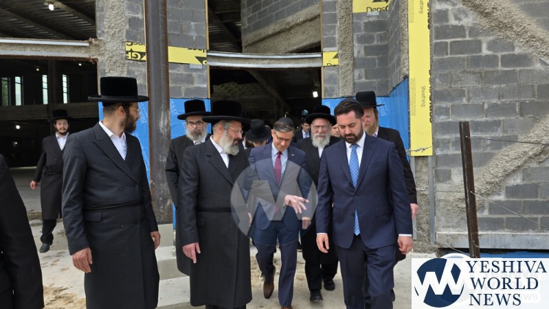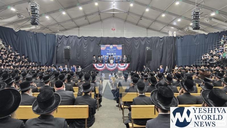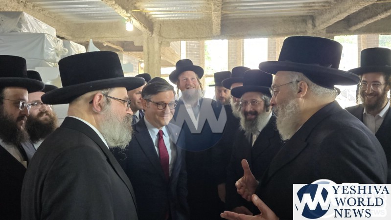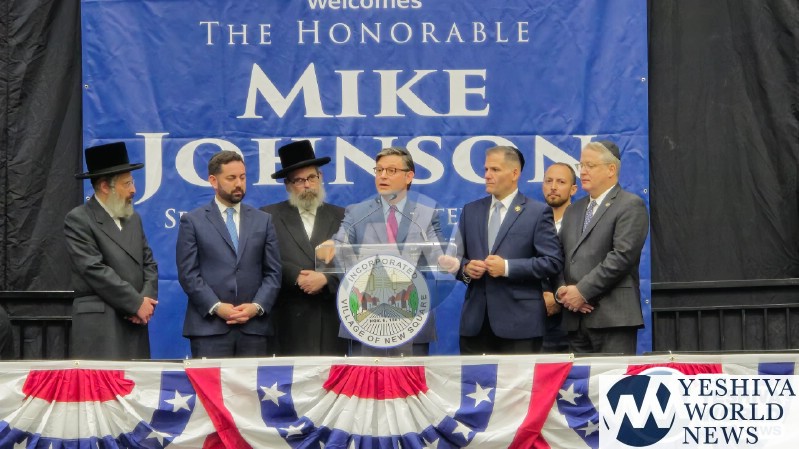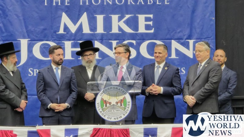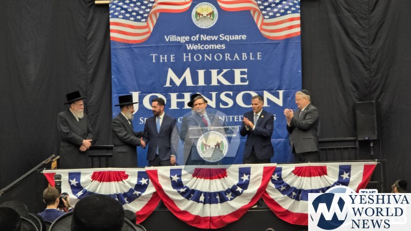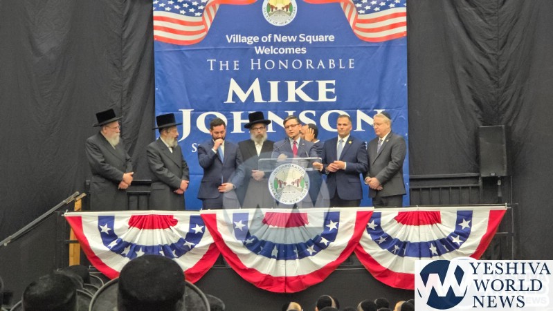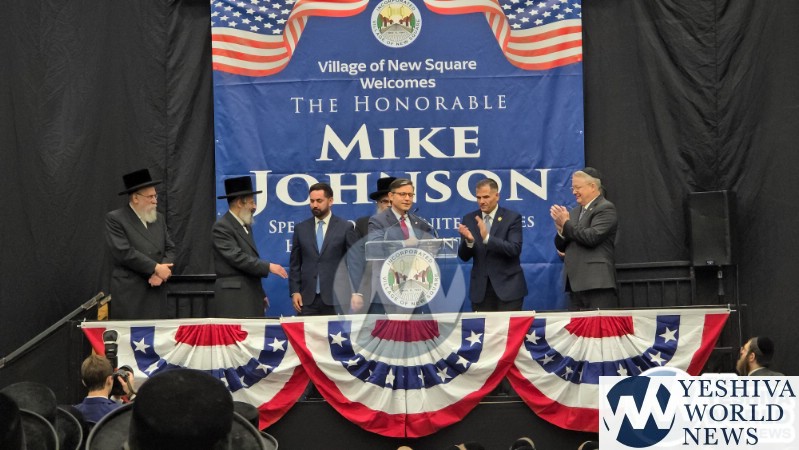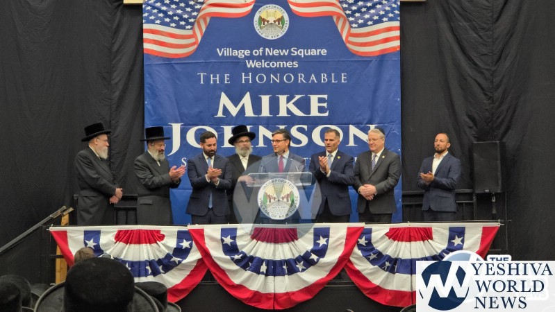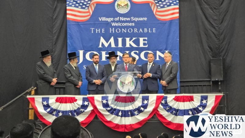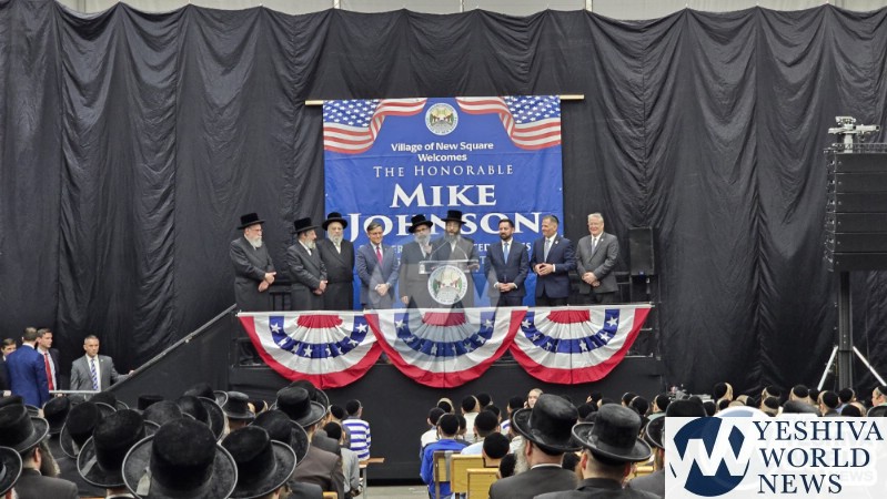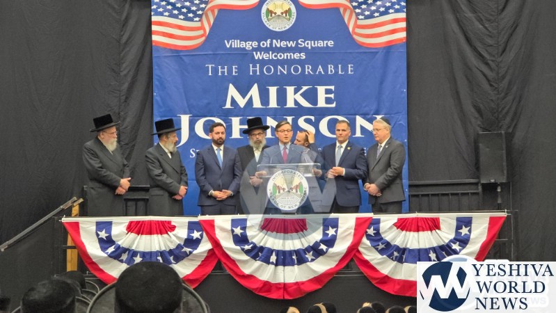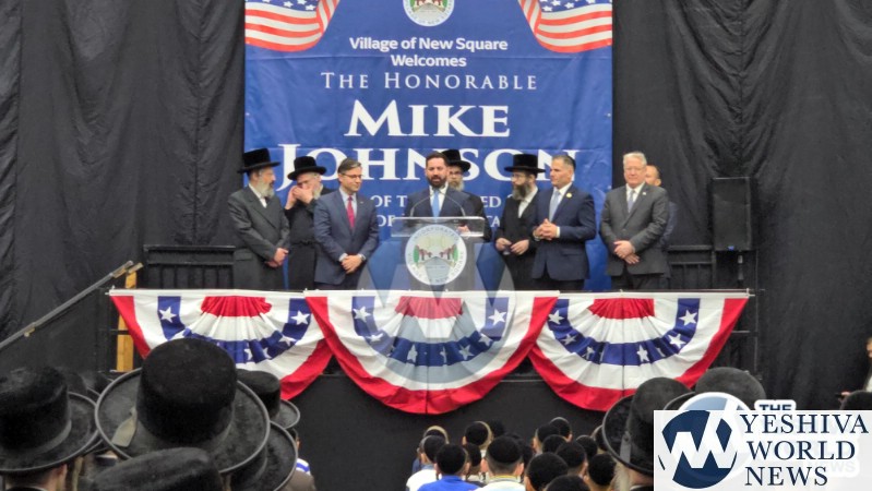 The final stop on Speaker Johnson’s itinerary was New Square, where he met with the Skvere Rebbe from 10:00 to 11:00 a.m. Following the private meeting, he addressed a large crowd in the large tent near The Skvere Rebbe’s residence.
