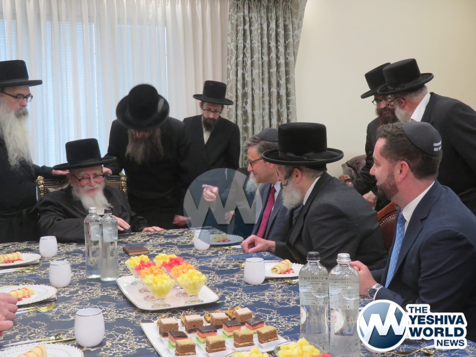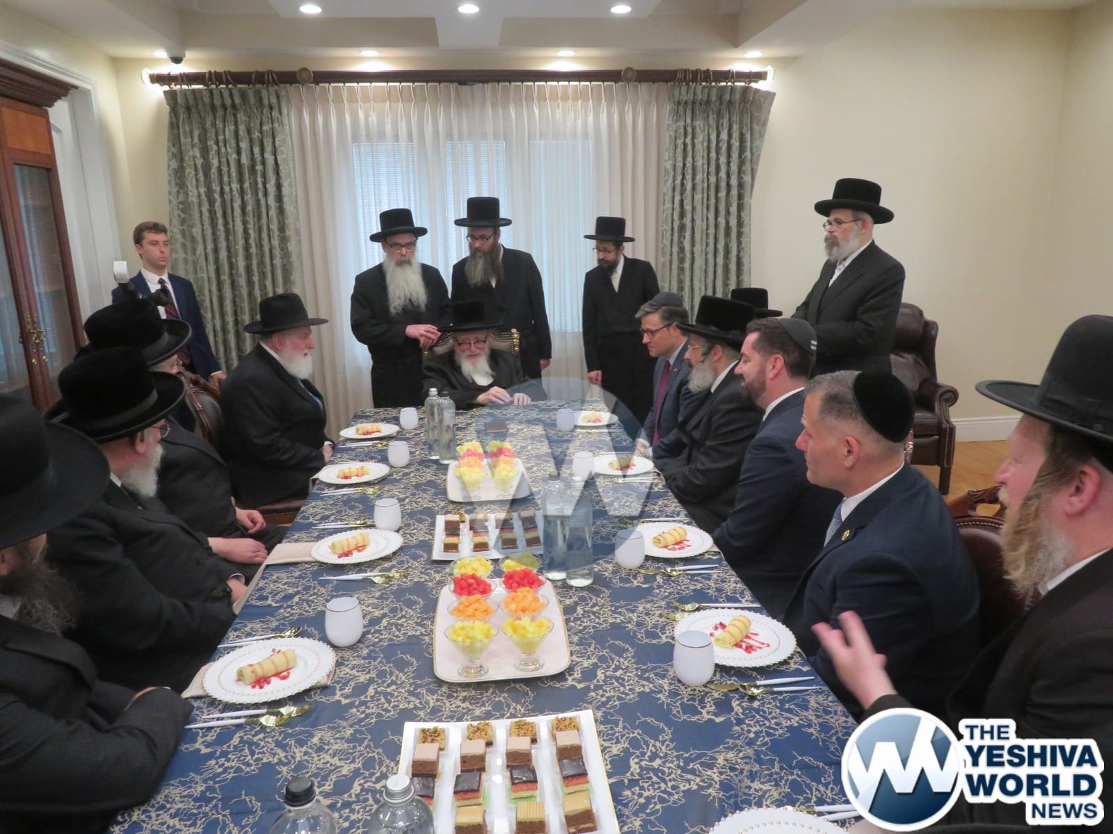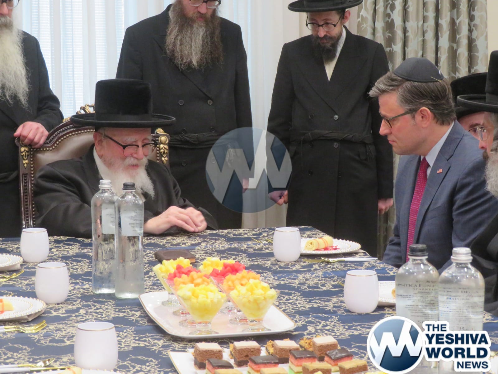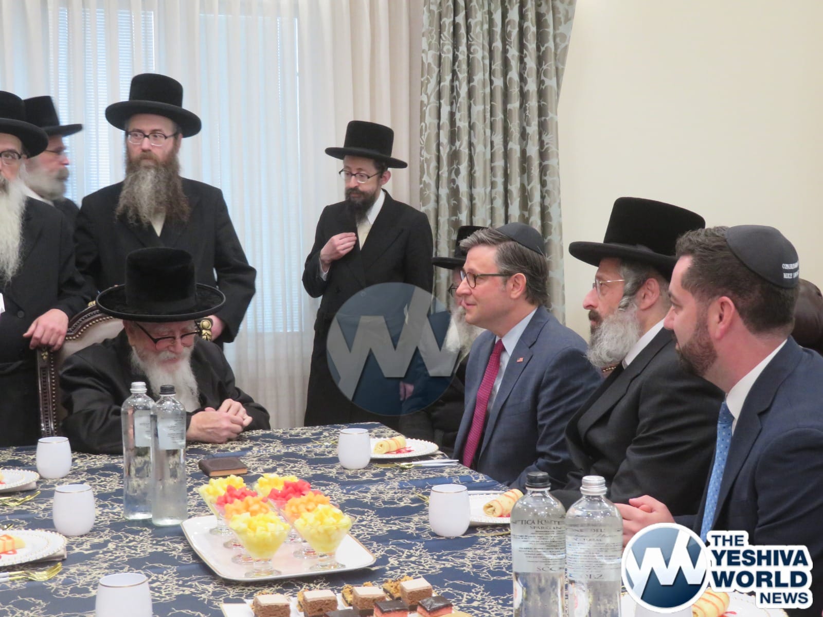 The final stop on Speaker Johnson’s itinerary was New Square, where he met with the Skvere Rebbe from 10:00 to 11:00 a.m. Following the private meeting, he addressed a large crowd in the large tent near The Skvere Rebbe’s residence.