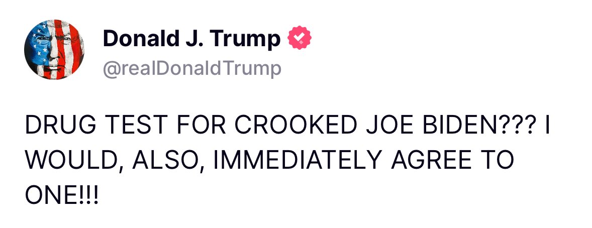 On Monday, Trump took to Truth Social, writing, “DRUG TEST FOR CROOKED JOE BIDEN??? I WOULD, ALSO, IMMEDIATELY AGREE TO ONE!!!” Last week, he suggested Biden would use cocaine before the debate. Rep. Ronny Jackson, a former White House physician, echoed Trump’s call, saying, “It’s embarrassing that I have to do this… but we don’t have any choice based on what’s going on.”