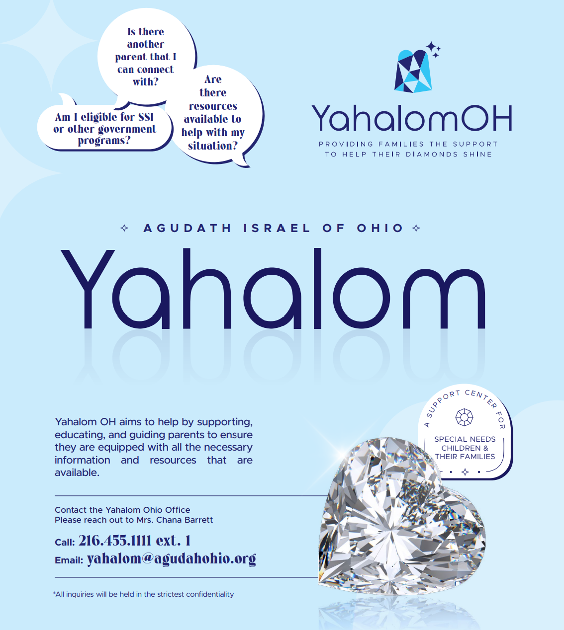 Each branch of Yahalom is here to assist the parents in their community obtain the appropriate resources by guiding, educating, and empowering parents to ensure they have the help and support they need and to reassure them that they are not alone. Under the leadership of Mrs. Chana Barrett, YahalomOH will do the same.