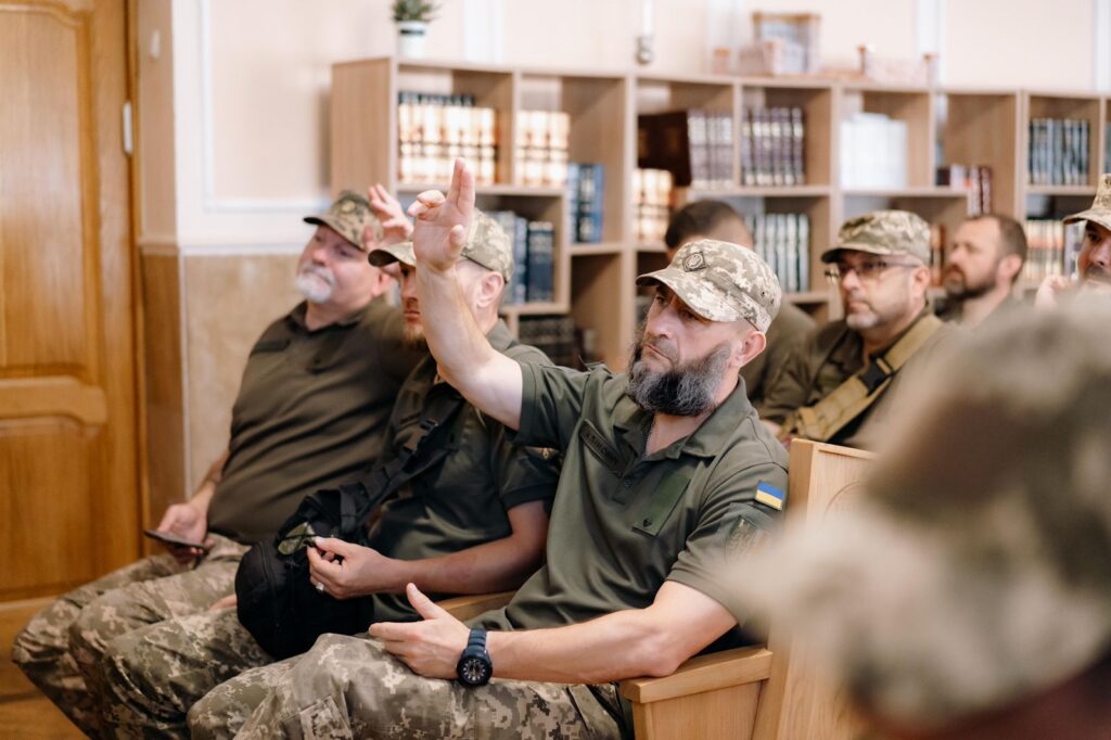 This past week, a group of religious officers and senior officers in the Ukrainian military visited the JCC Beit Menachem community center. During the visit, the officers met with Rabbi Yonatan Markovitch, the Chief Rabbi of Kyiv, engaged in conversation, and listened to a lecture on various topics related to Judaism and military life.