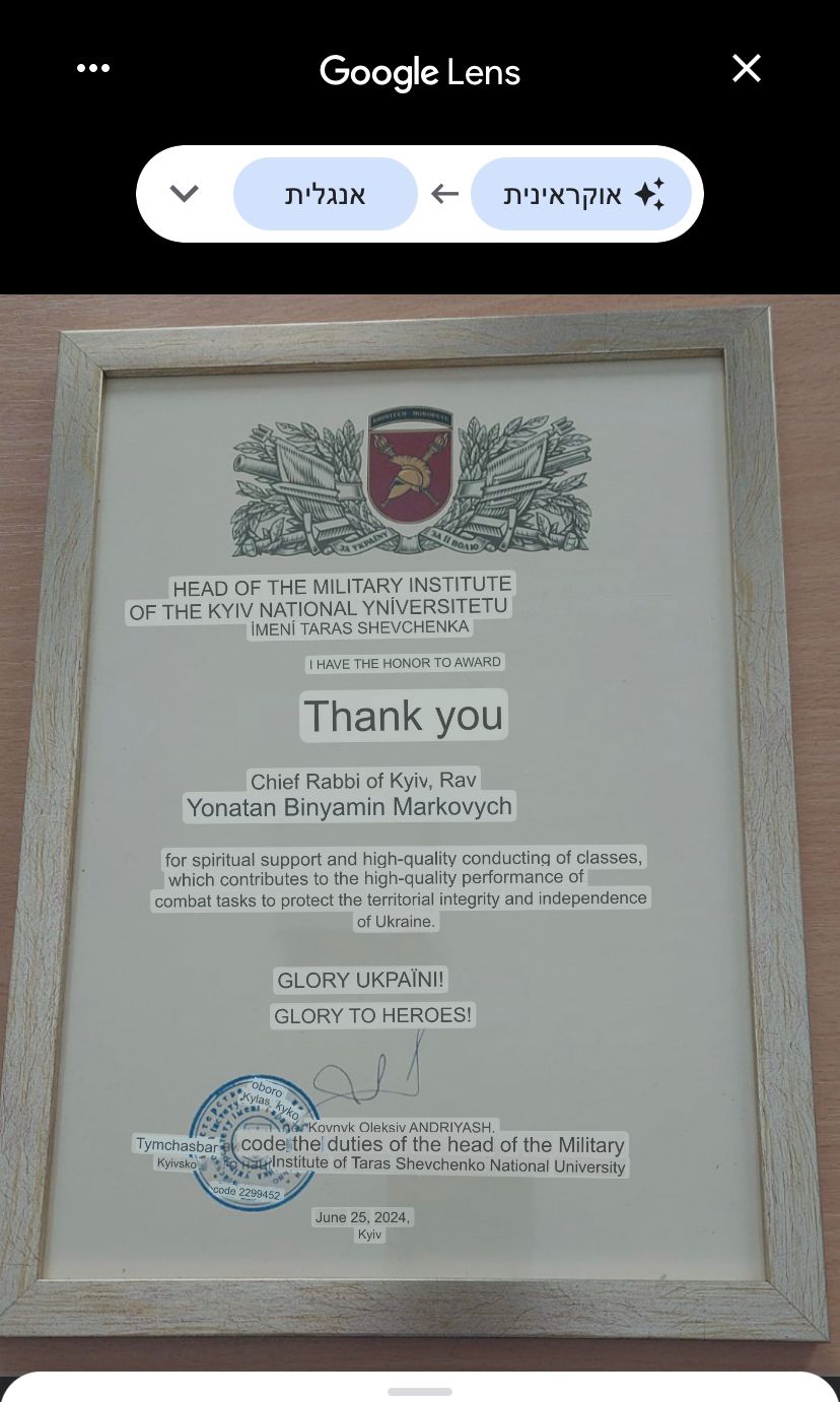 At the end of the visit, the officers presented Rabbi Markovitch with a certificate of appreciation for his significant contribution to Ukraine’s security forces in general and to Jewish soldiers serving in the military in particular. The certificate, issued by the higher education institution of the Ukrainian military, stated that the recognition was awarded to the Rabbi for his “spiritual support, which contributes to the high-quality execution of combat missions in the defense of Ukraine.”