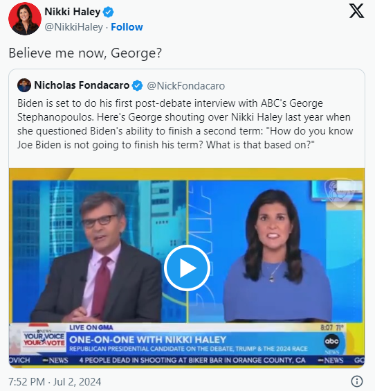 The exchange has gone viral again, and Haley taunted Stephanopoulos today on social media, saying “Believe me now, George?”