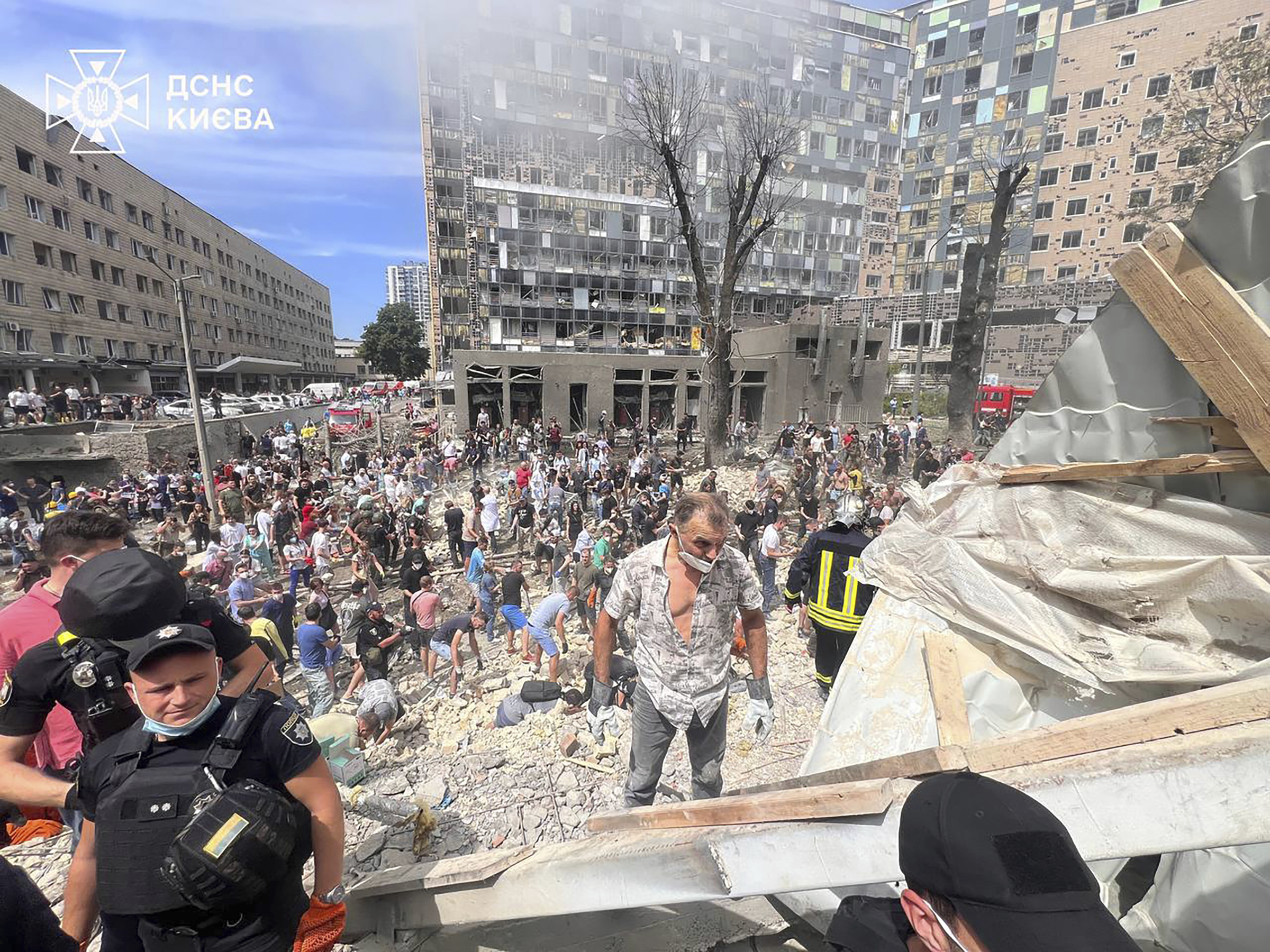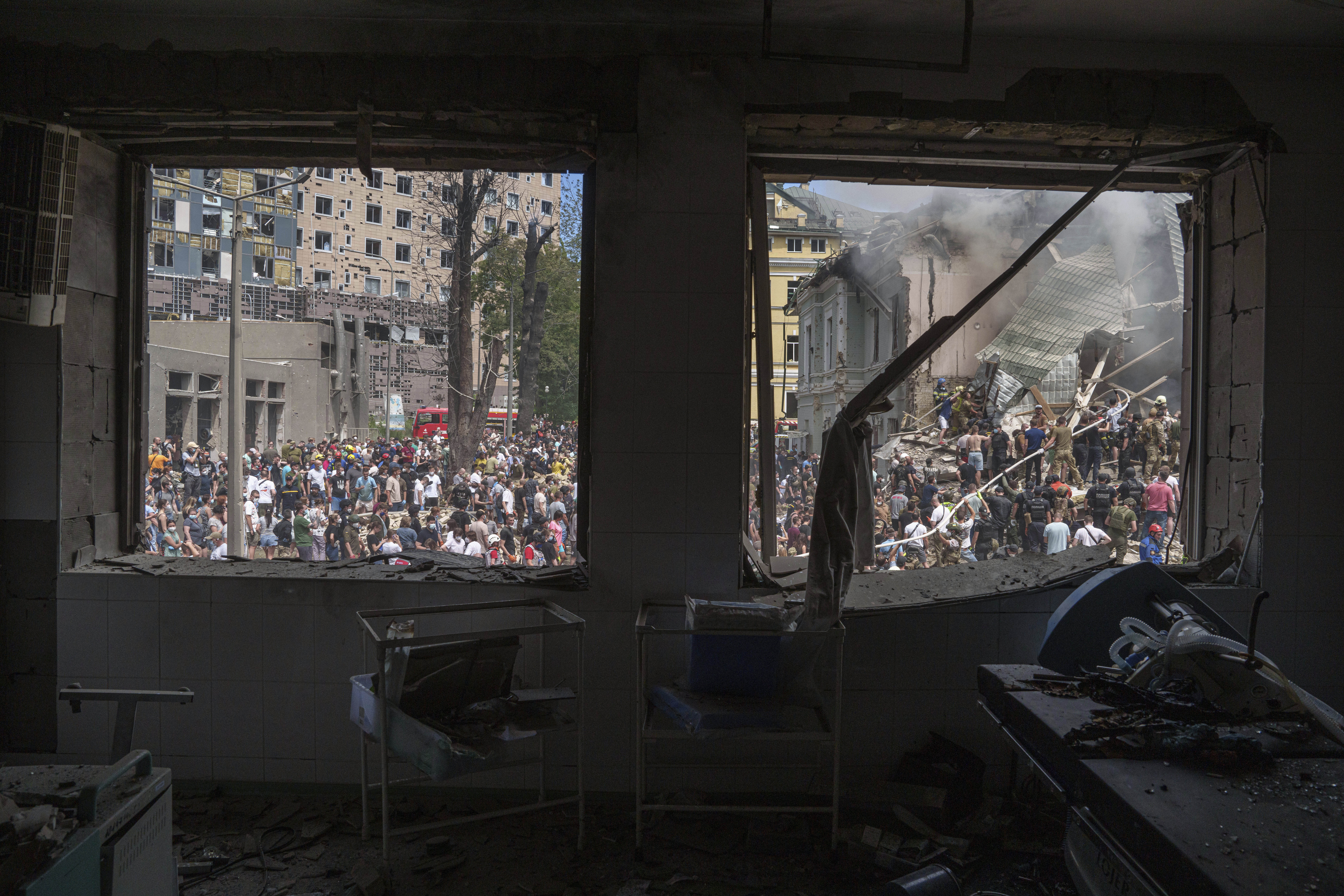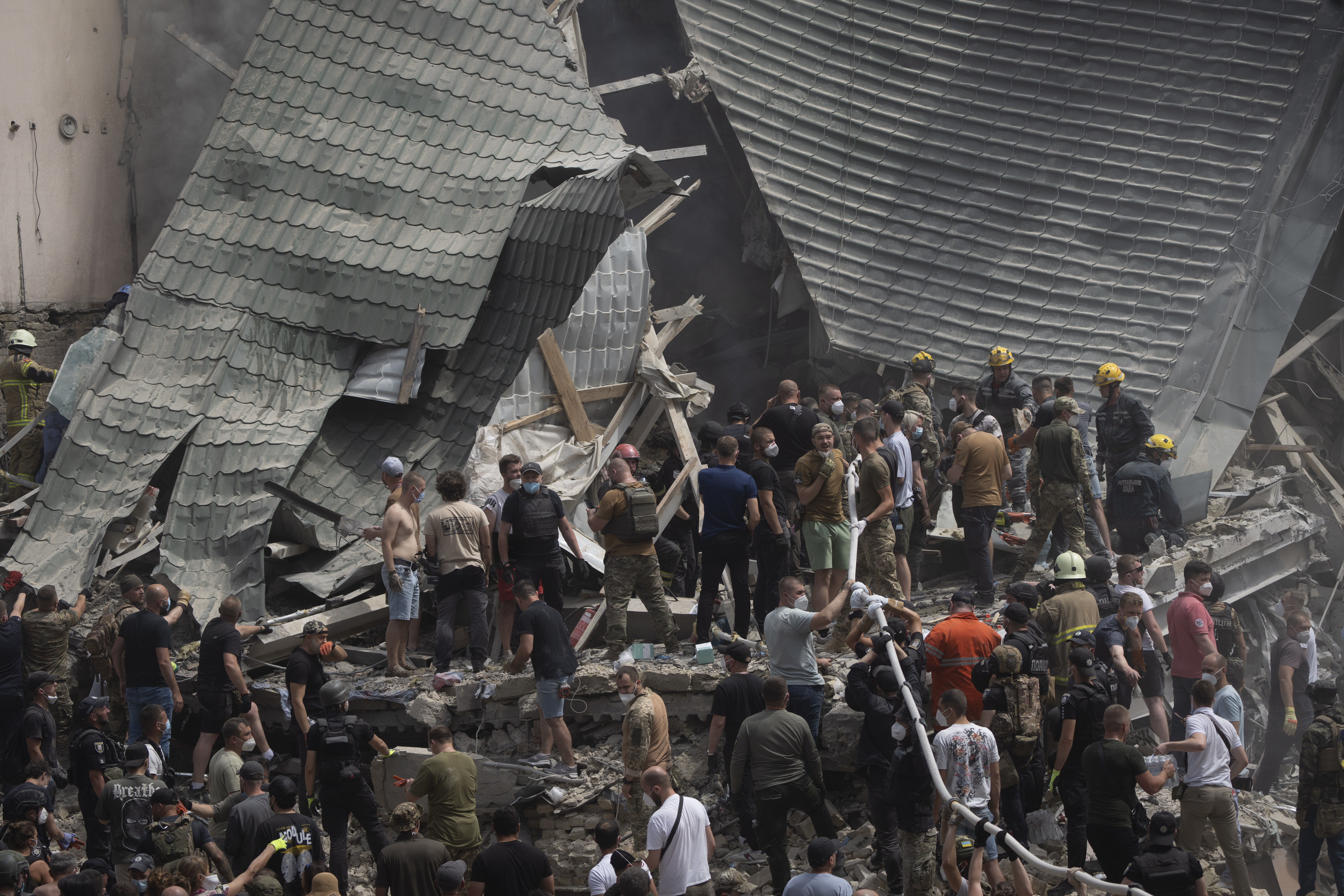 At the Okhmatdyt children’s hospital in Kyiv, rescuers were searching for people under the rubble of a partially collapsed, two-story wing of the facility. Kyiv Mayor Vitali Klitschko said at least 16 people, seven of them children, were injured.