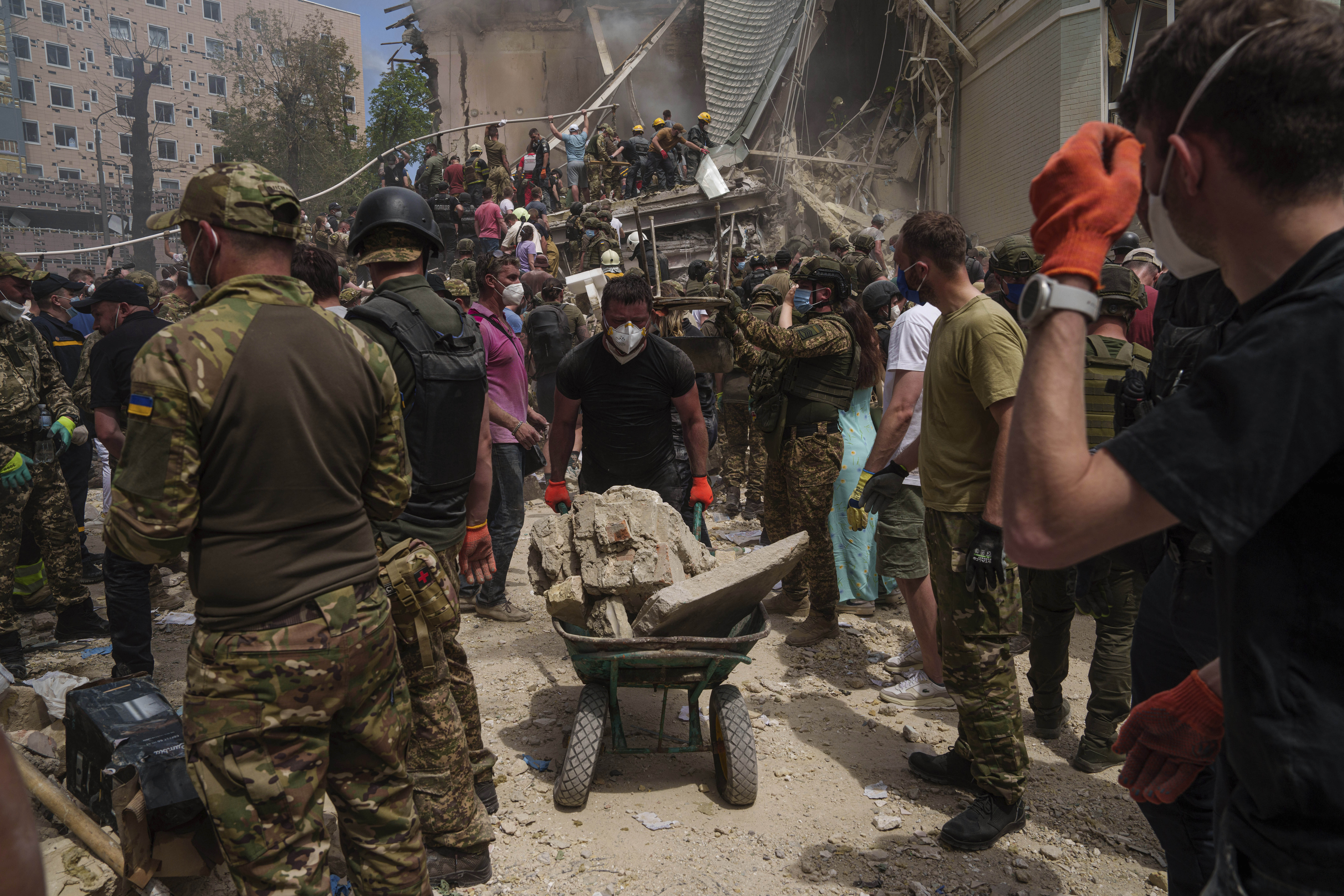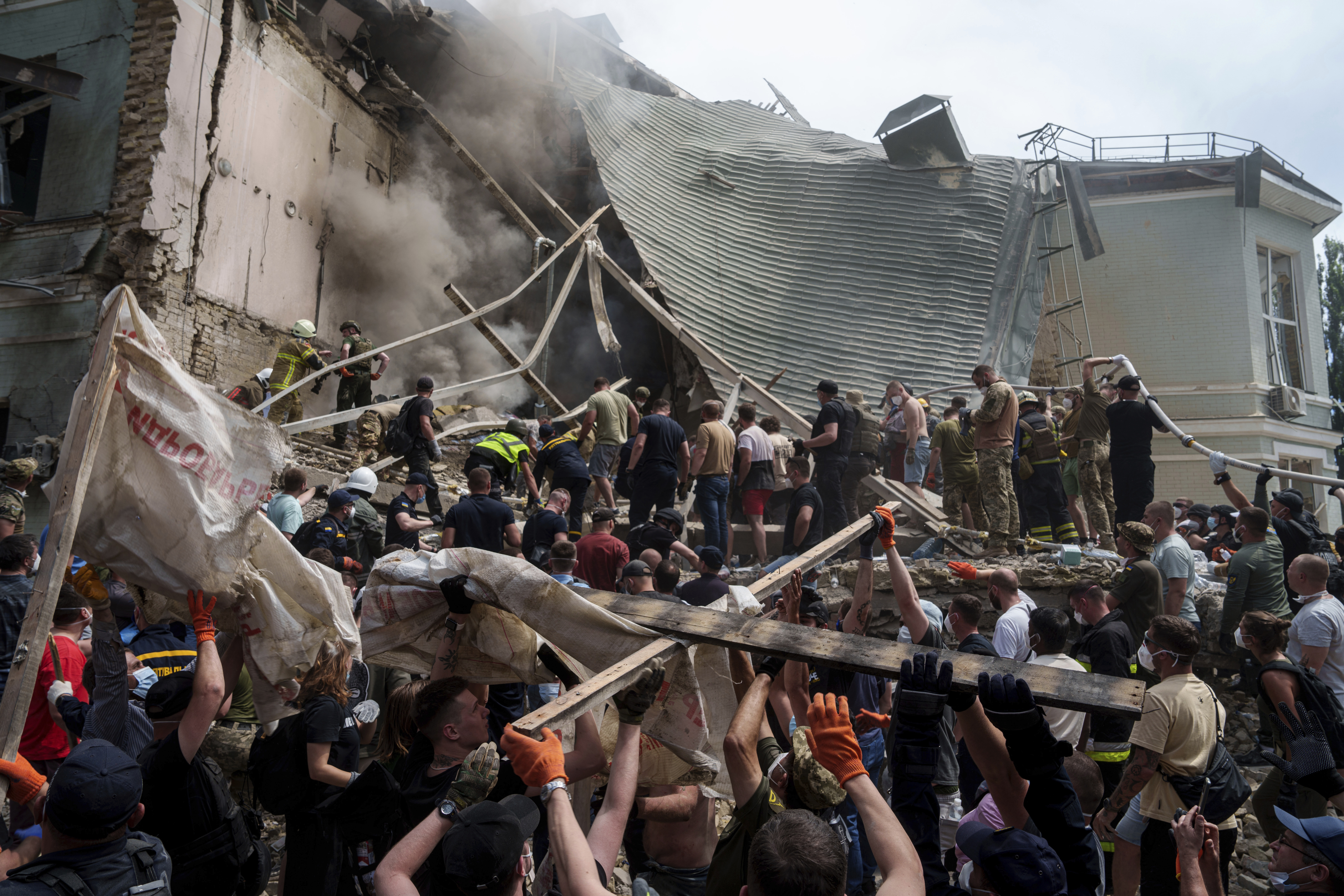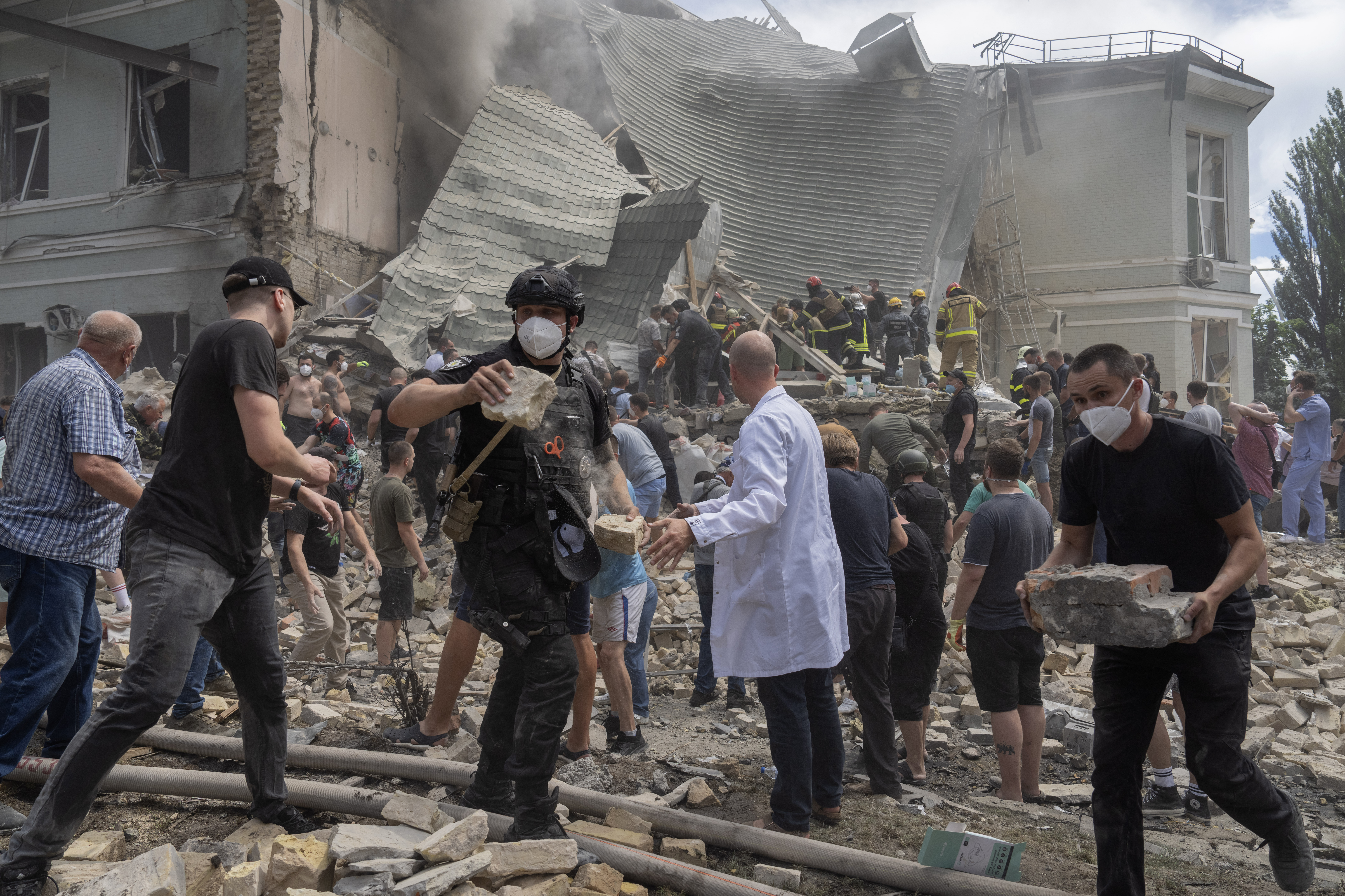 At the Okhmatdyt children’s hospital in Kyiv, rescuers were searching for people under the rubble of a partially collapsed, two-story wing of the facility. Kyiv Mayor Vitali Klitschko said at least 16 people, seven of them children, were injured.