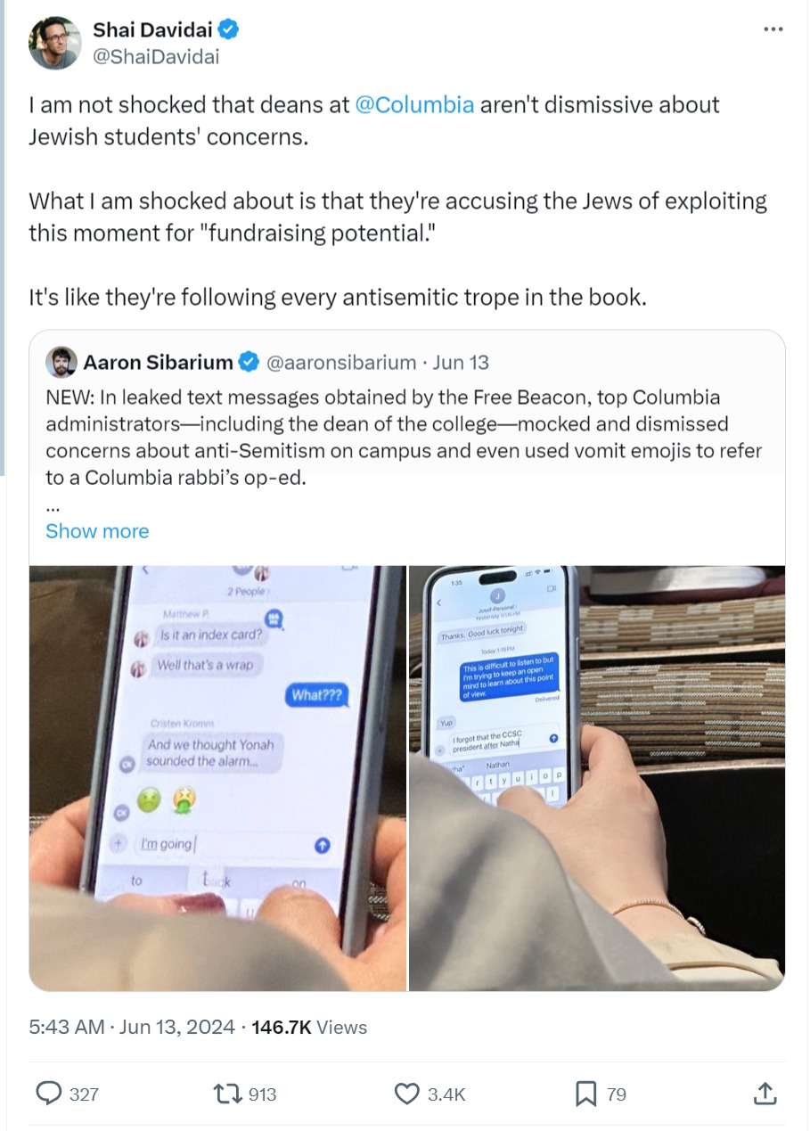 The House Committee on Education and the Workforce published some of the messages last week. The text messages, which include numerous offensive messages that had not previously been reported, show senior Columbia College administrators mocking and disparaging the university’s Jewish community, and trafficking in antisemitic tropes regarding Jews and money. The texts accused Jewish students of coming from a “place of privilege,” dismissed their concerns, disparaged officials responsible for Jewish student life, and insinuated that efforts to address the explosion of antisemitism on Columbia’s campus were merely a fundraising ploy.