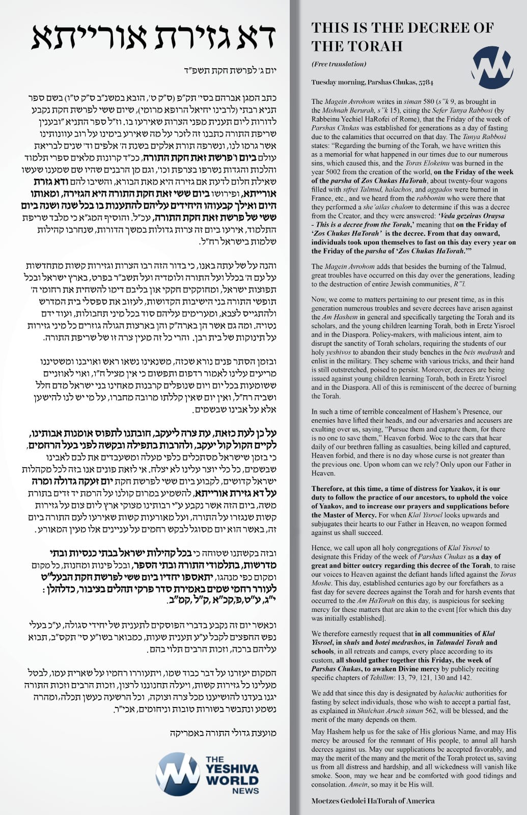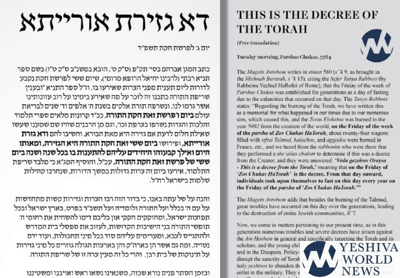 Hence, we call upon all holy congregations of Klal Yisroel to designate this Friday of the week of Parshas Chukas as a day of great and bitter outcry regarding this decree of the Torah, to raise our voices to Heaven against the defiant hands lifted against the Toras Moshe. This day, established centuries ago by our forefathers as a fast day for severe decrees against the Torah and for harsh events that occurred to the Am HaTorah on this day, is auspicious for seeking mercy for these matters that are akin to the event [for which this day was initially established].