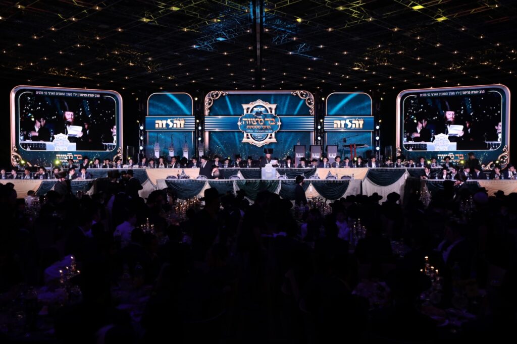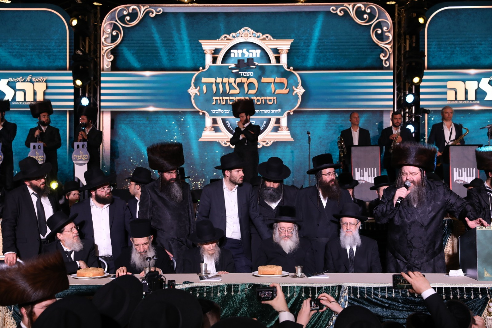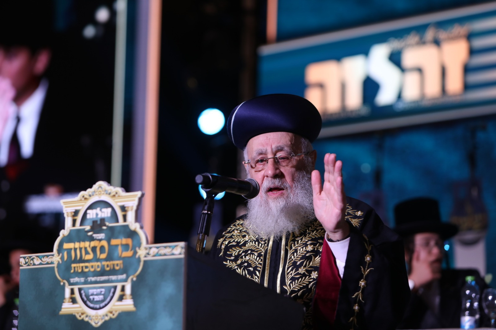 yisrael who entered the hall to honor the choshuve bar mitzvah boys and the “Zeh Lazeh” organization. The massive audience stood on their feet singing “yomim al ymei melech tosif” in honor of the Gedolei Yisrael headed by Maran Mashgiach HaGaon HaTzaddik Reb Don Segal, Maran the Rishon Letzion HaGaon Rav Yitzchak Yosef and with the participation of Maran Rosh Yeshiva of Mir HaGaon Rav Eliezer Yehuda Finkel, Maran HaGaon Rav David Yosef, Hagaon Chacham Nissim Ben Shimon, the Biala Rebbe , HaGaon Rav Ben Zion Kook, rabbis, and members of the Knesset and public figures.