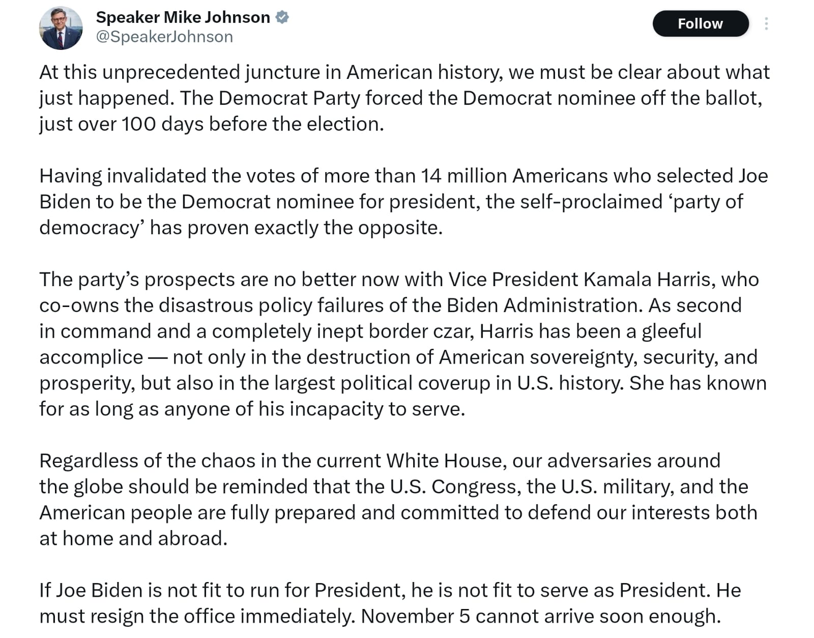 House Speaker Mike Johnson calls on Biden to resign from office.