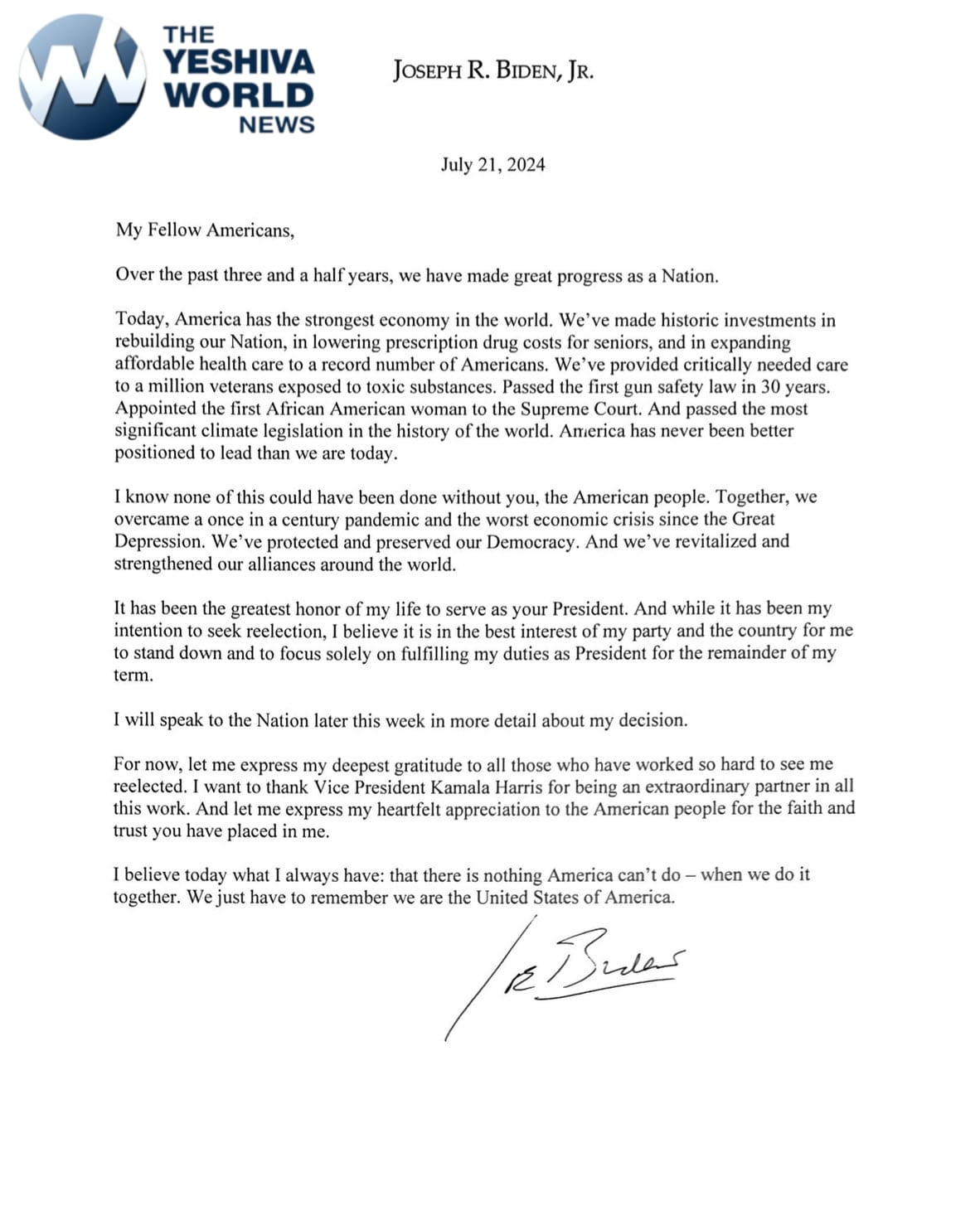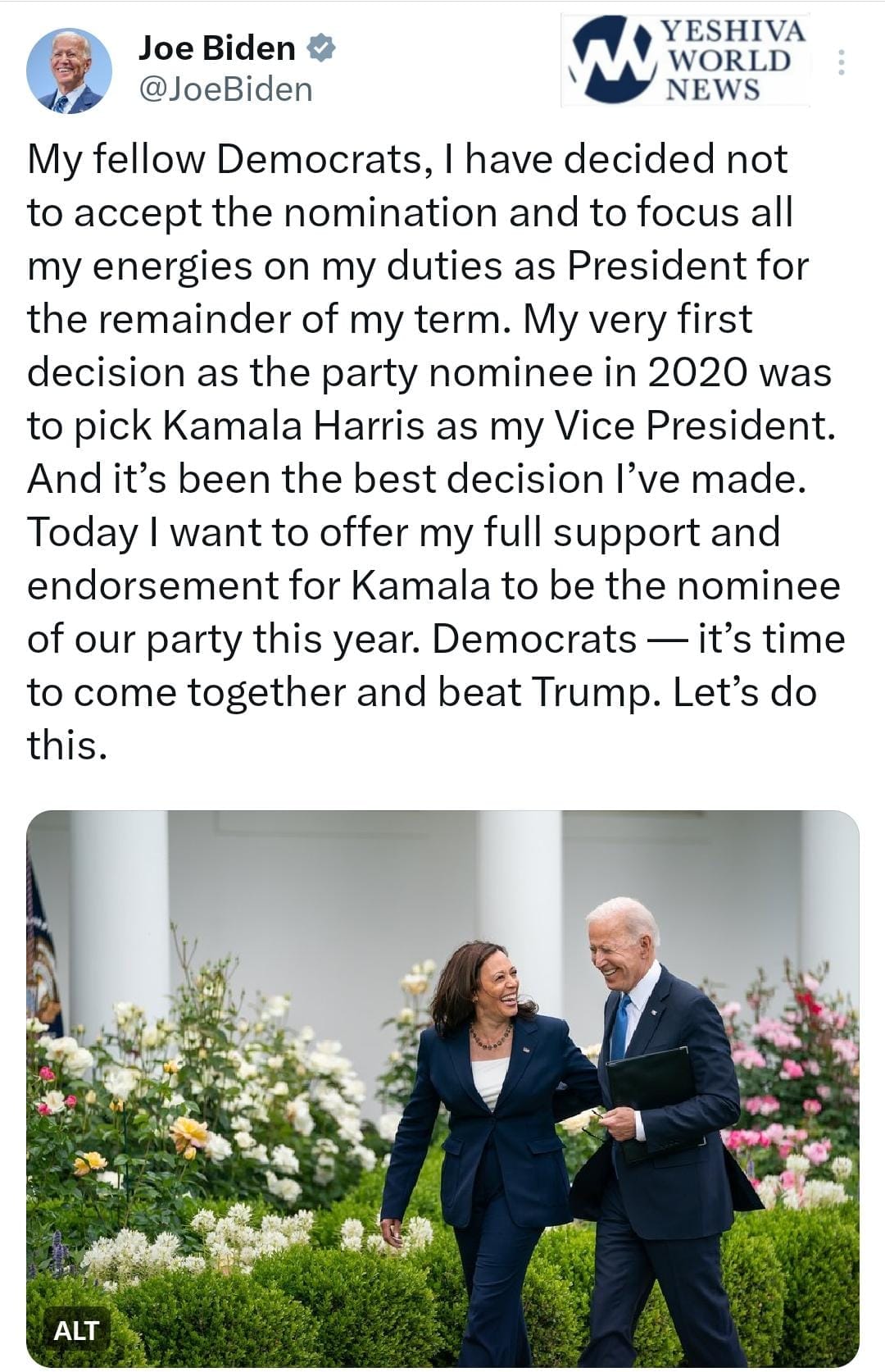 In a follow-up message, Biden endorsed Vice President Kamala Harris to replace him atop the Democratic ticket.