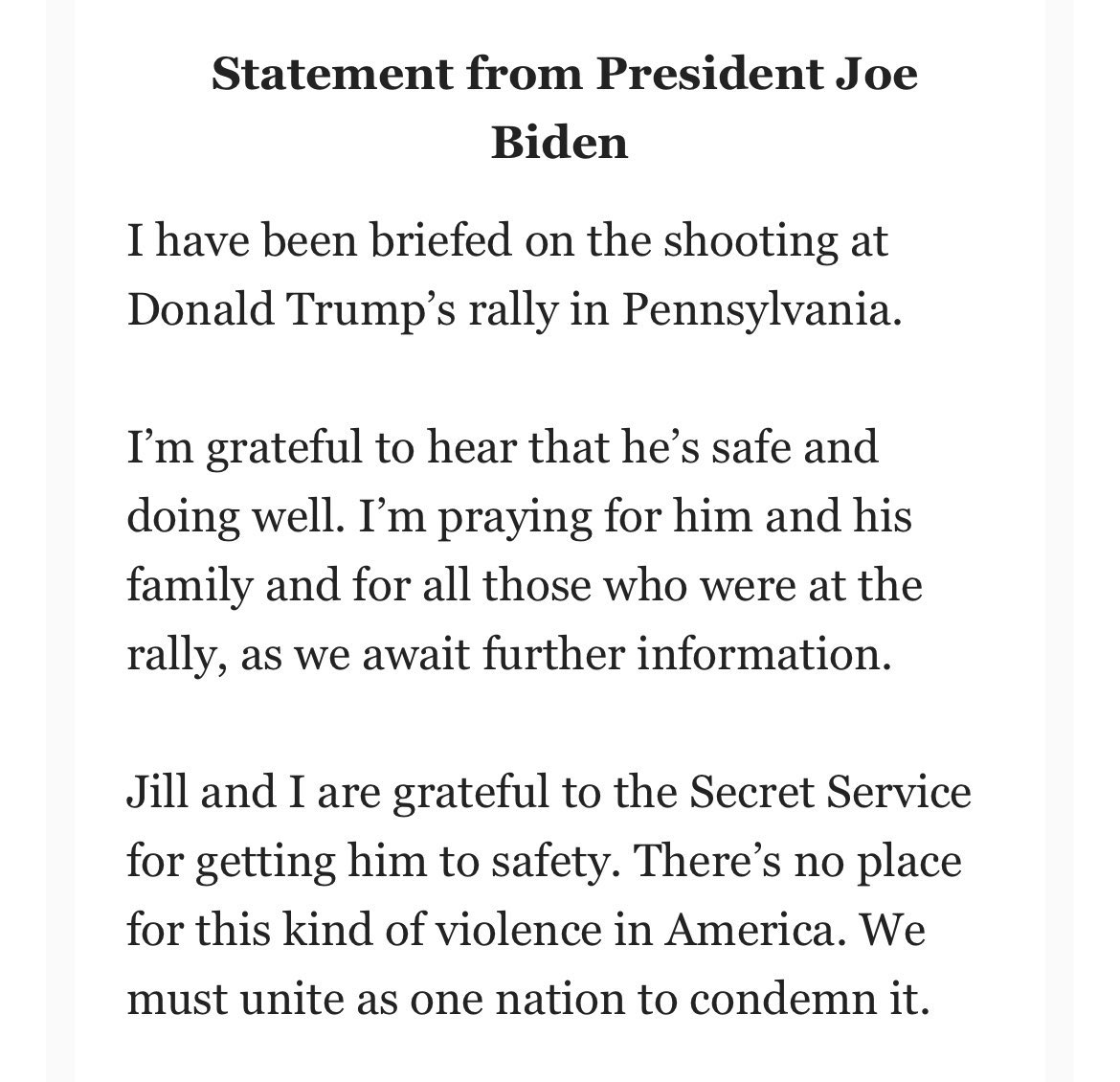 “Violence targeted at any political party or political leader is absolutely unacceptable. It has no place in Pennsylvania or the United States,” he said.
