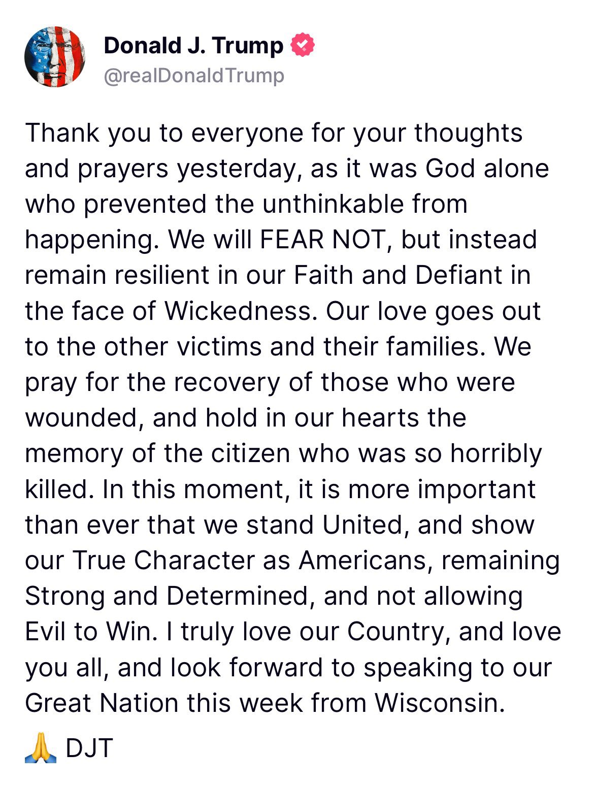 “In this moment, it is more important than ever that we stand United, and show our True Character as Americans, remaining Strong and Determined, and not allowing Evil to Win,” his post said.