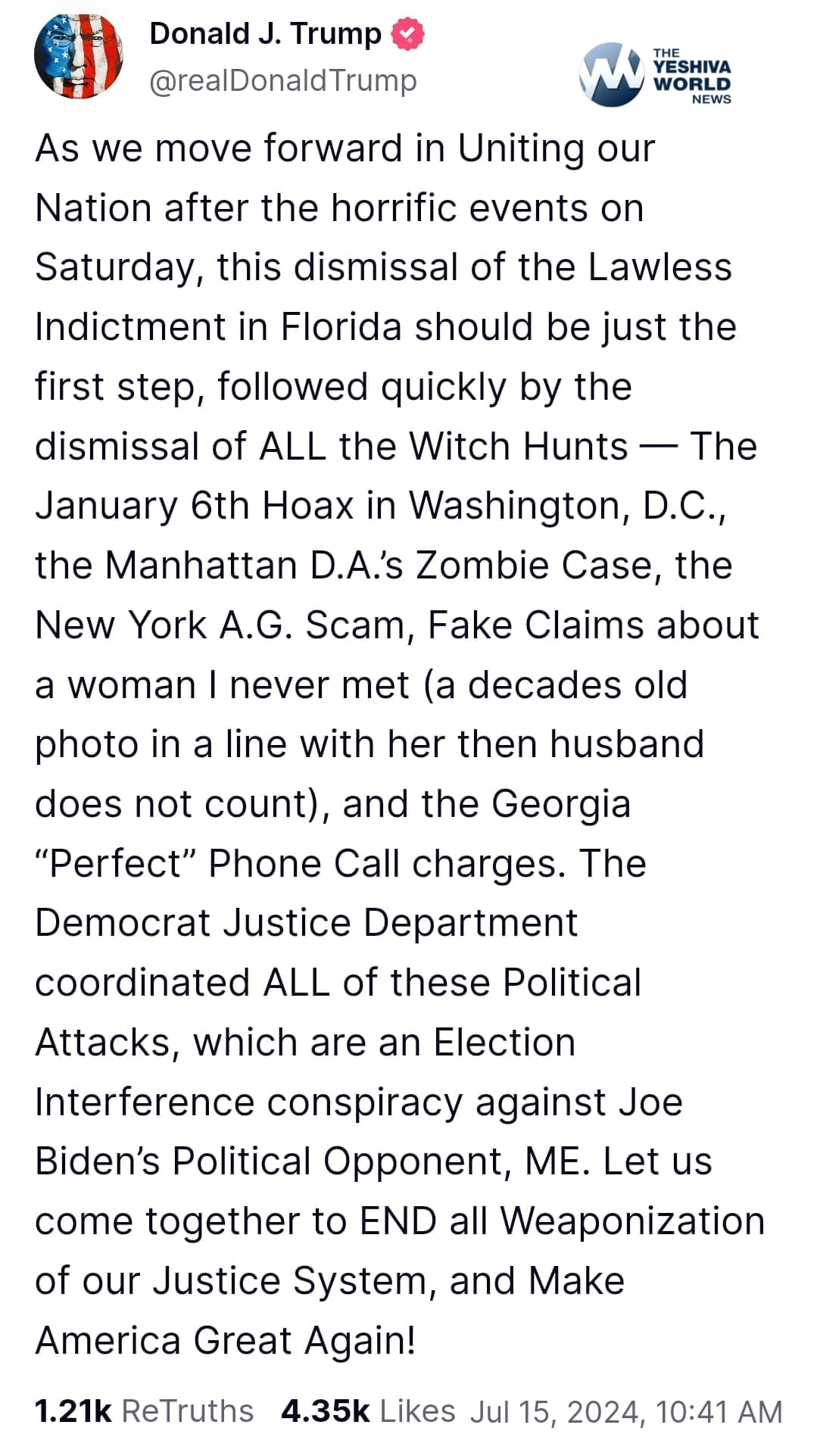 In a statement on his social media platform, Trump said that the dismissal “should be just the first step” and that the three other cases, which he called “Witch Hunts,” should also be dismissed.