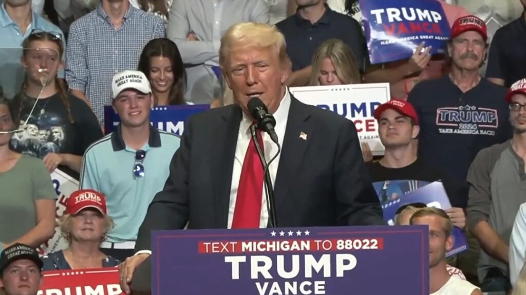 Trump mentioned the Heritage Foundation’s “Project 2025,” calling it a product of the “radical right,” which he opposes. He then returned to the theme of being an extremist, saying, “They keep saying, ‘He’s a threat to democracy.’ I’m saying, what… did I do for democracy? Last week I took a bullet for democracy.”
