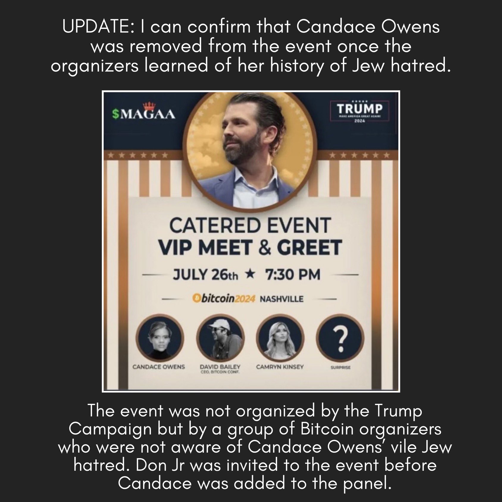Owens was announced as a panelist for the MAGAA-sponsored event, billed as a “fireside chat” about Bitcoin, alongside Trump Jr. and former Trump White House official Camryn Kinsey. However, her image was removed from promotional materials on Tuesday following a fierce backlash from conservative critics and Jewish allies of the former president.