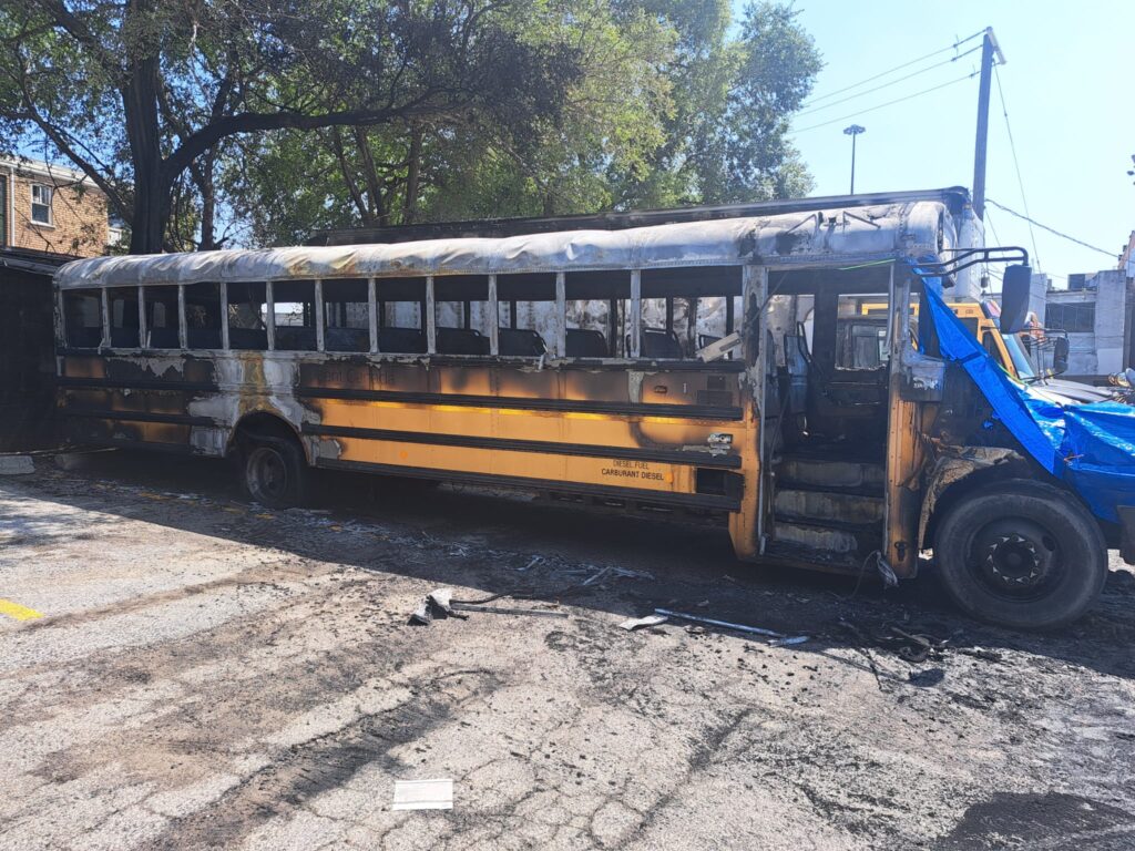 A Bobov school bus was gutted by flames in an early-morning arsonist-set blaze. The incident occurred at around 5 AM in a parking lot behind a No Frills supermarket on Wilson Avenue near Bathurst Street.