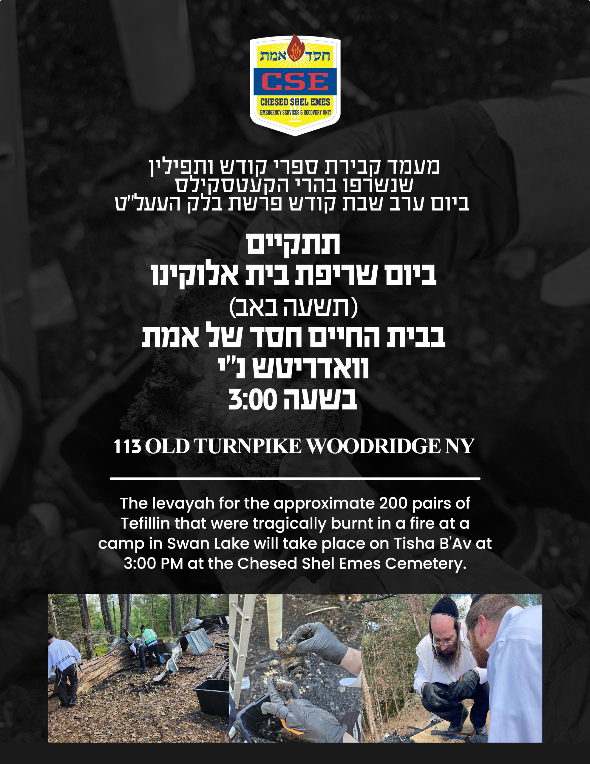 The kevurah of the tefillin and seforim will take place on Tisha B’Av at the Chesed Shel Emes cemetery, 113 Old Turnpike, Woodridge, NY, at 3 PM.
