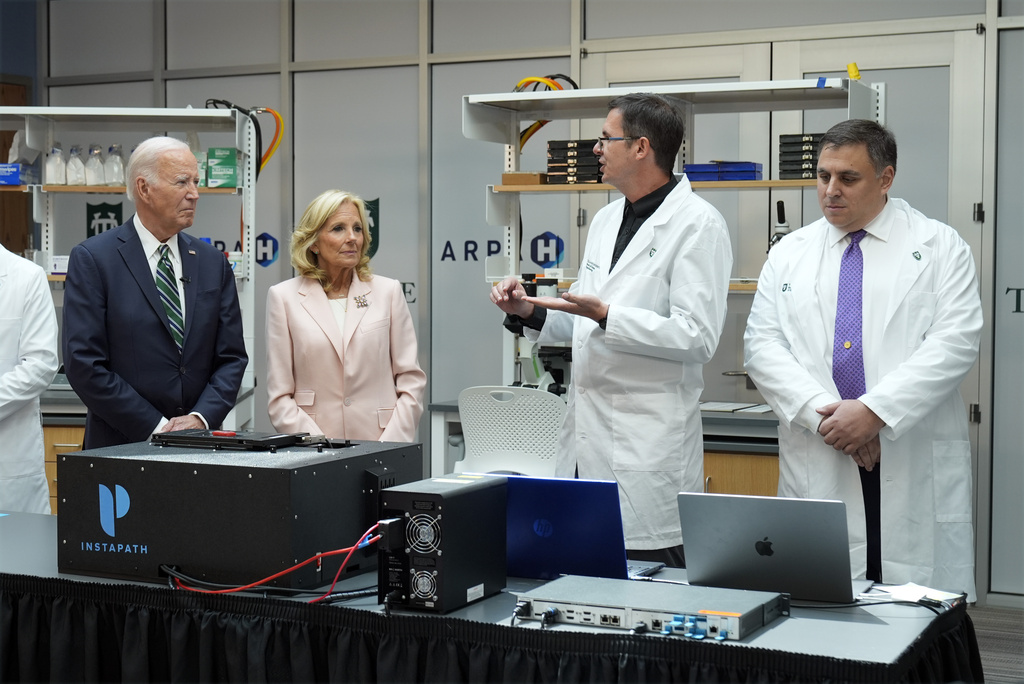 The president and first lady Jill Biden toured medical facilities that receive federal funding to investigate cancer treatments at Tulane University. Researchers used a piece of raw meat to demonstrate how they are working to improve scanning technology to quickly distinguish between healthy and cancerous cells during surgeries.