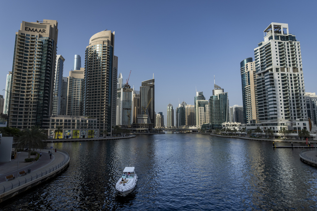 People sit on a boat as it sails along Dubai Marina, United Arab Emirates, Tuesday, Aug. 13, 2024. (AP Photo/Altaf Qadri)