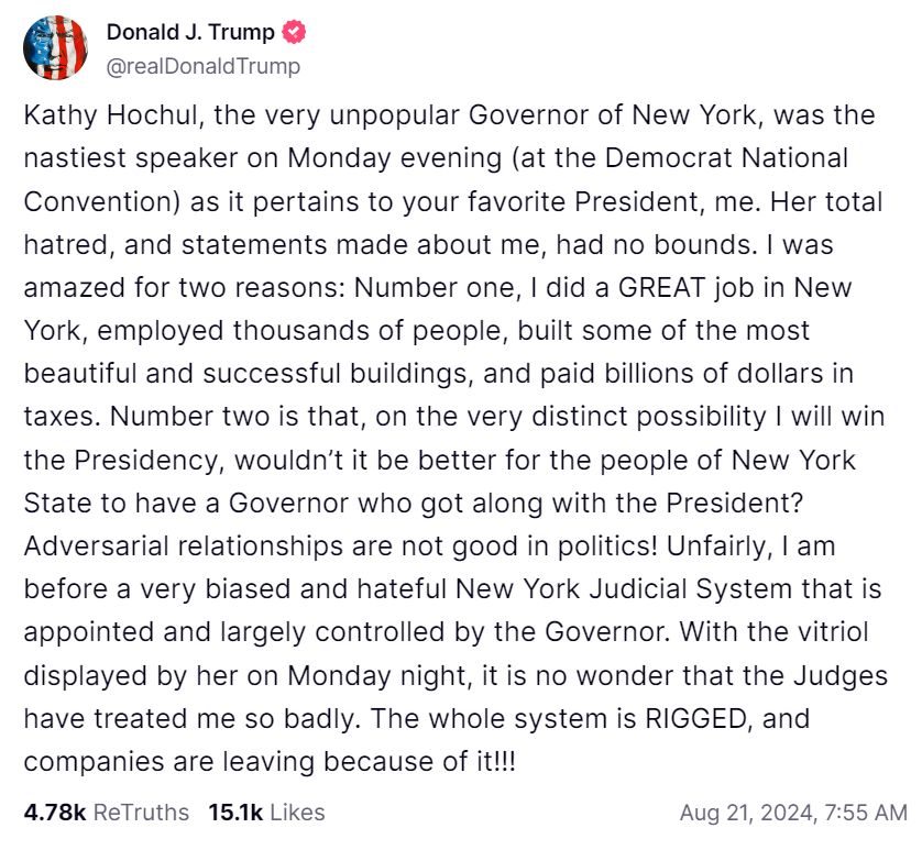 “Kathy Hochul, the very unpopular Governor of New York, was the nastiest speaker on Monday evening (at the Democrat National Convention) as it pertains to your favorite President, me,” Trump posted. He further complained about Hochul’s “total hatred” for him, writing that her statements “had no bounds.”