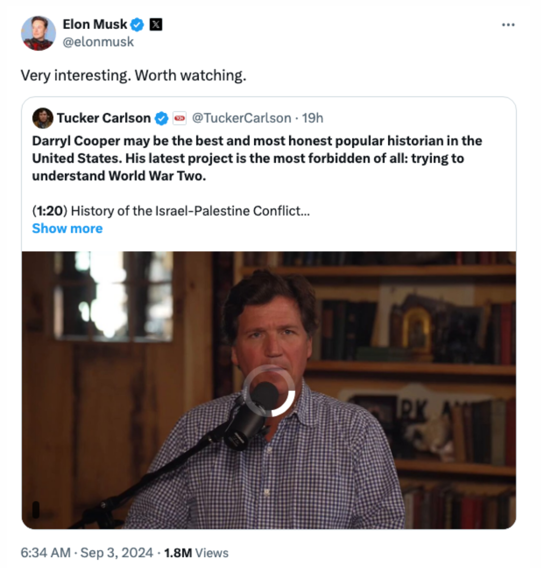 Elon Musk has deleted a tweet in which he praised Tucker Carlson’s interview with Darryl Cooper, a self-proclaimed historian who attempted to whitewash the Holocaust. The interview, published on Monday on The Tucker Carlson Show, featured Cooper making controversial claims, including calling Winston Churchill the “chief villain” of World War II and asserting that the millions of deaths during the Holocaust were an unintended consequence of Germany’s inability to handle prisoners of war.