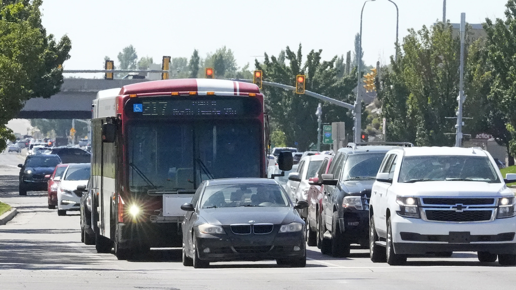 A commuter bus equipped with a radio transmitter passes a connected traffic light on Redwood Road, part of an effort to improve safety and efficiency by allowing cars to communicate with the roadside infrastructure and one another on Friday, Sept. 6, 2024, near Taylorsville, Utah. (AP Photo/Rick Bowmer)