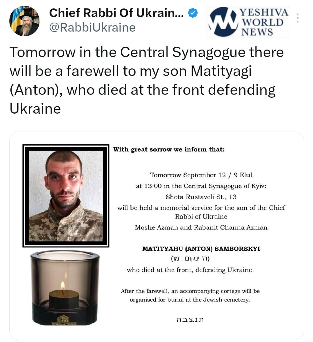 Rabbi Azman announced the devastating news on Twitter, saying that a levaya would be held for his son, Matityahu (Anton) Samborski hy”d, at the Central Synagogue. Samborski, whom Rabbi Azman adopted in 2002 at the age of 11, had been officially listed as missing in action in late July.