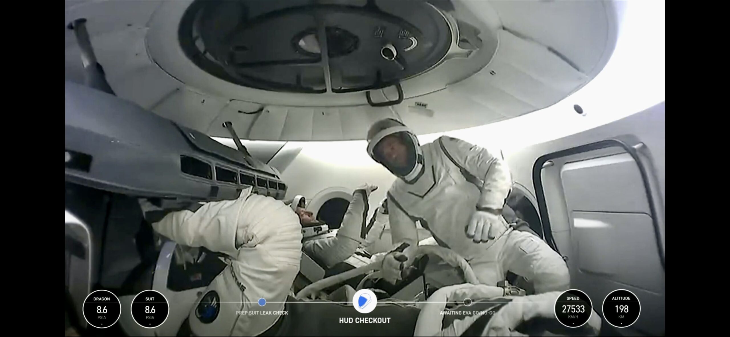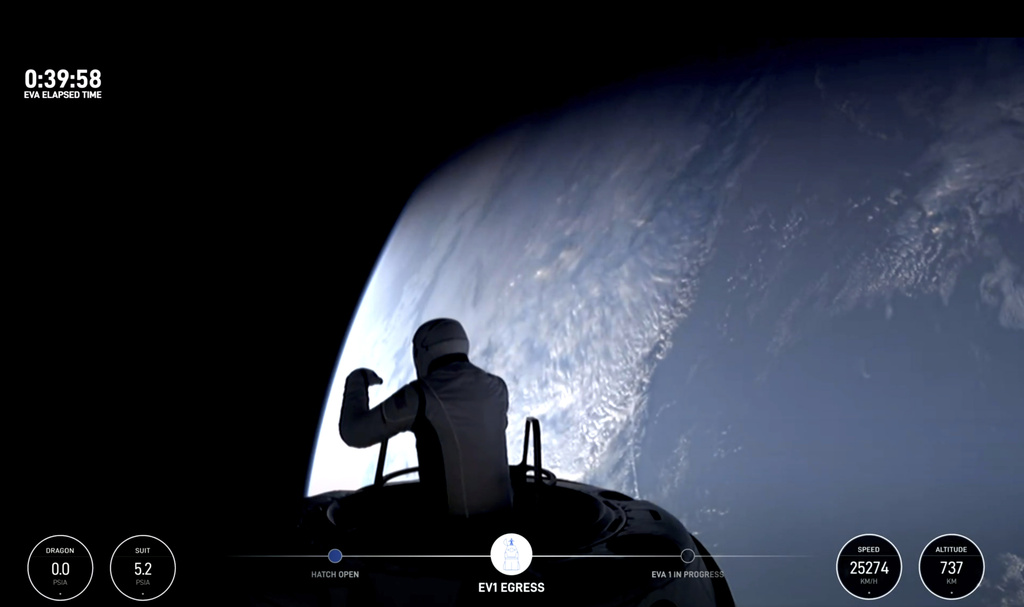 This first spacewalking test involved more stretching than walking. Isaacman kept a hand or foot attached to it the whole time as he flexed his arms and legs to see how the spacesuit held up. The hatch sported a walker-like structure for extra support.