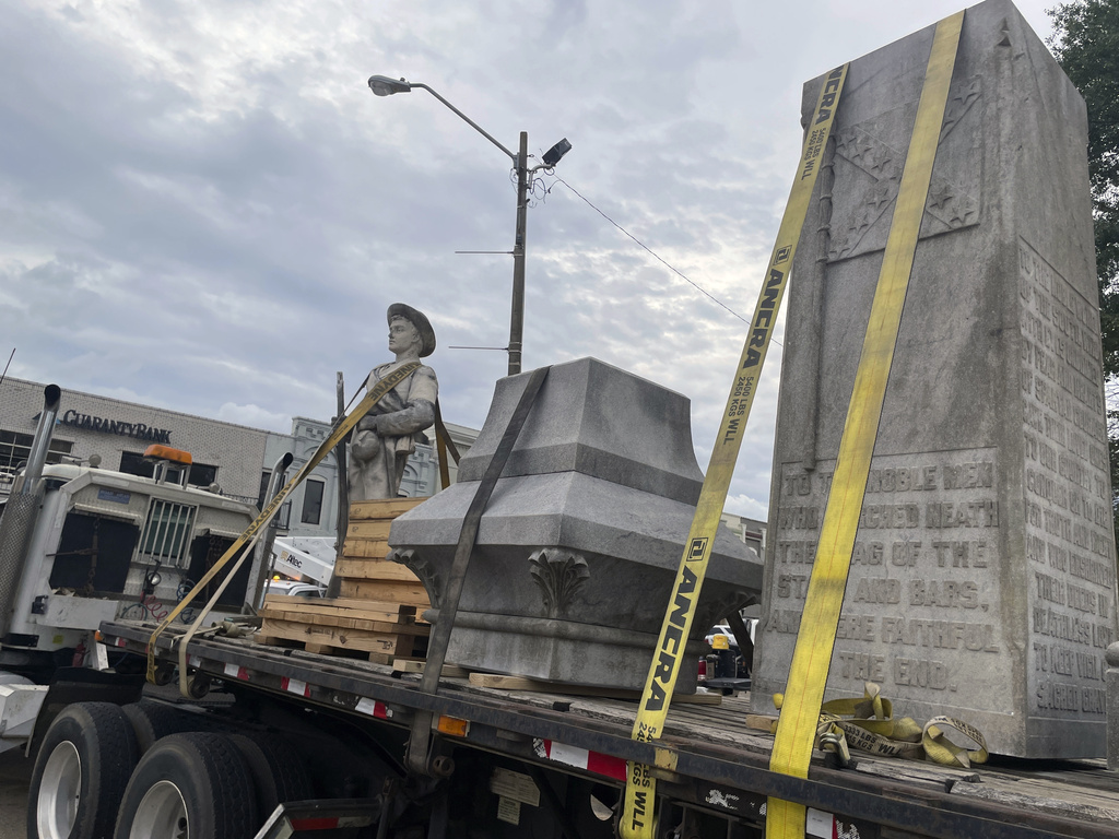 A Mississippi town has taken down a Confederate monument that stood on the courthouse square since 1910 — a figure that was tightly wrapped in tarps the past four years, symbolizing the community’s enduring division over how to commemorate the past.