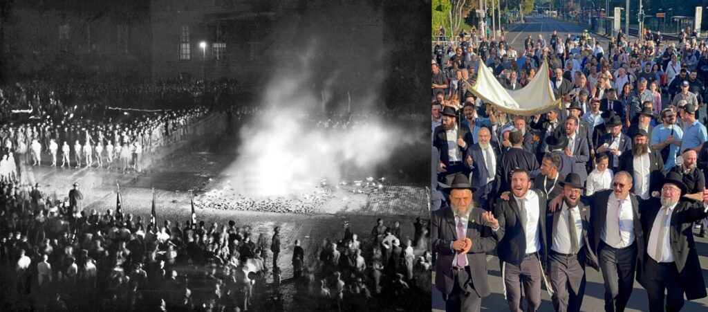 On May 10, 1933, in Bebelplatz, Berlin, over 20,000 books by Jewish authors were burned in a notorious display of Nazi hatred. Among those books were likely many Sifrei Kodesh from the Jewish community of Berlin.