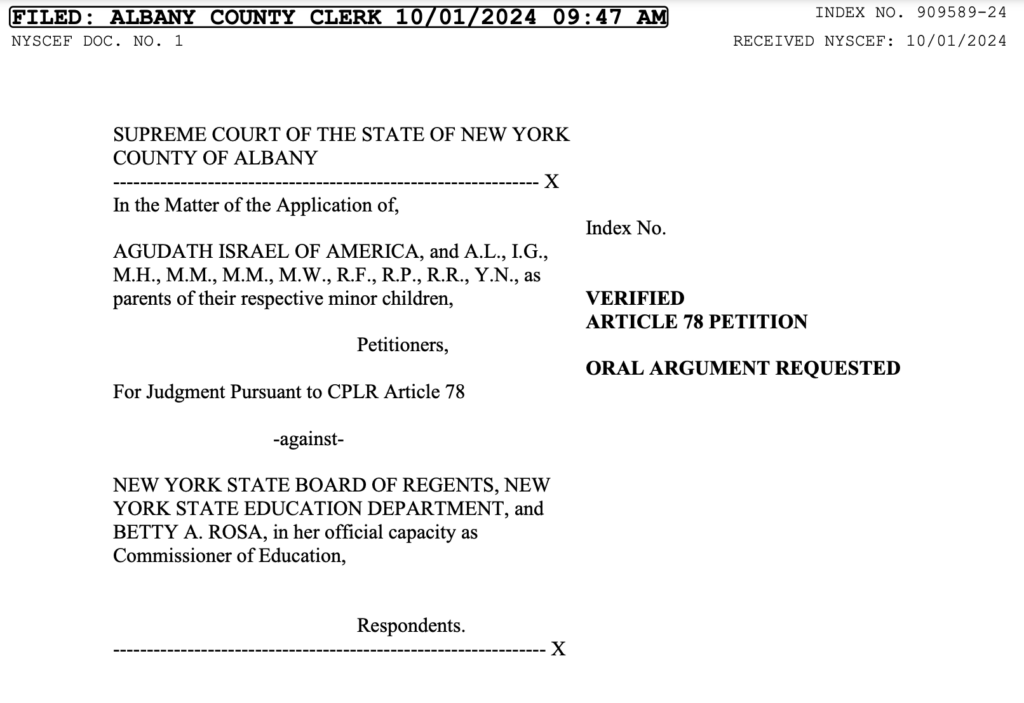 Over the past months, Agudath Israel has engaged in intense advocacy efforts—directly with the State Education Department, the NYC Department of Education, and legislators—and organized two public comment campaigns in which thousands of parents voiced their opposition to the new regulation. Despite some progress, the overall situation remains dire. After careful consideration, and in consultation with its rabbinic leadership, Agudath Israel decided it had no choice but to pursue legal action.