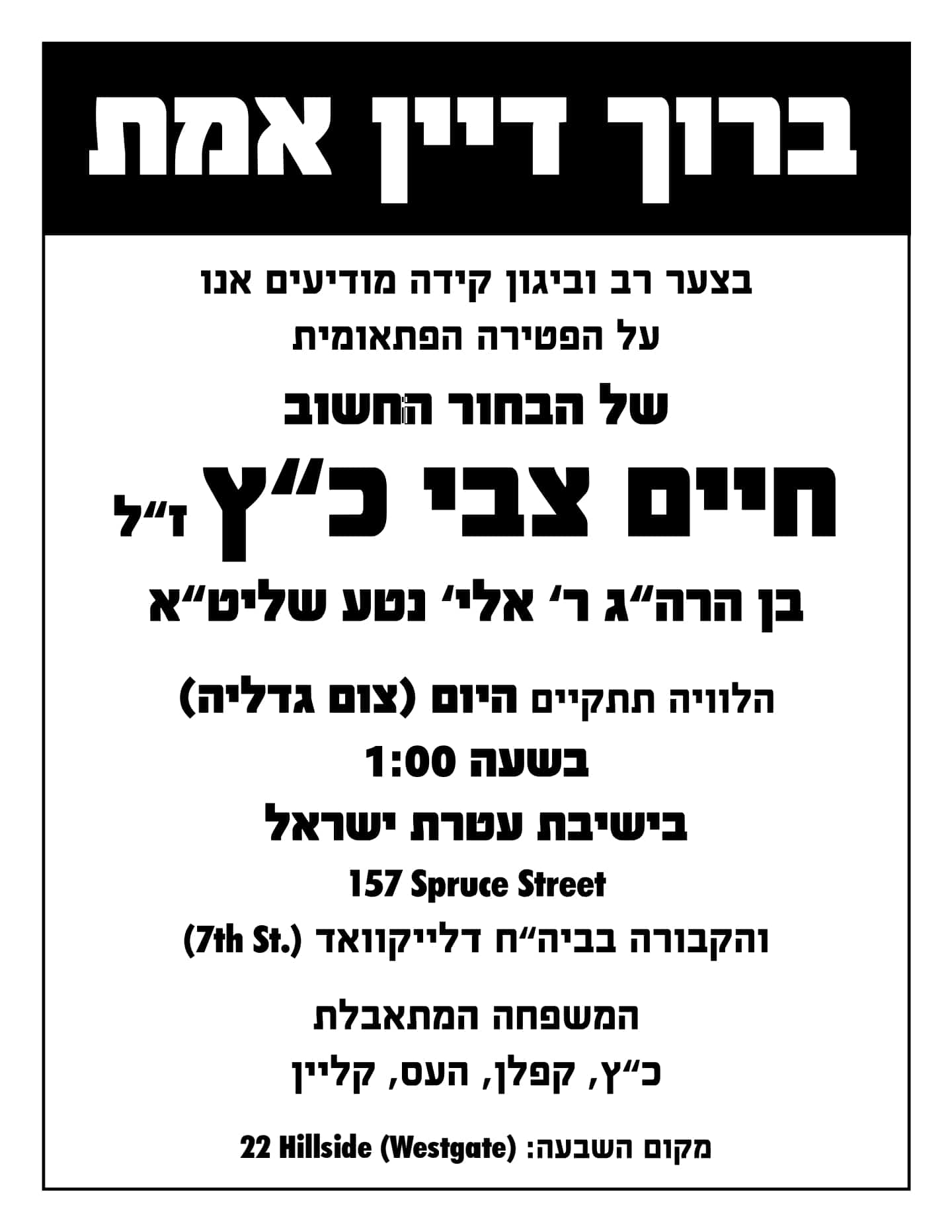 The levaya is tentatively scheduled to take place at 1 PM Sunday at Yeshiva Ateres Yisroel, 157 Spruce Street, in Lakewood. Kevurah will follow at the Lakewood bais olam.