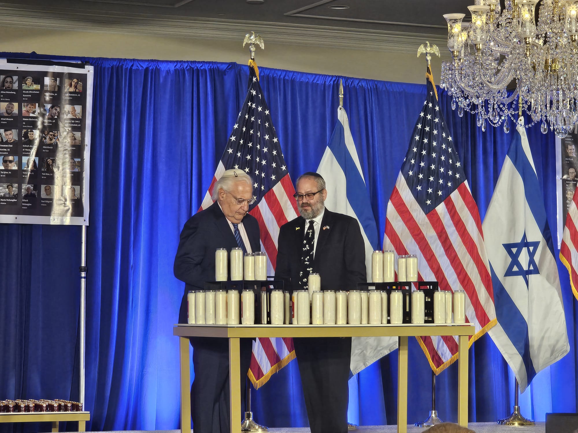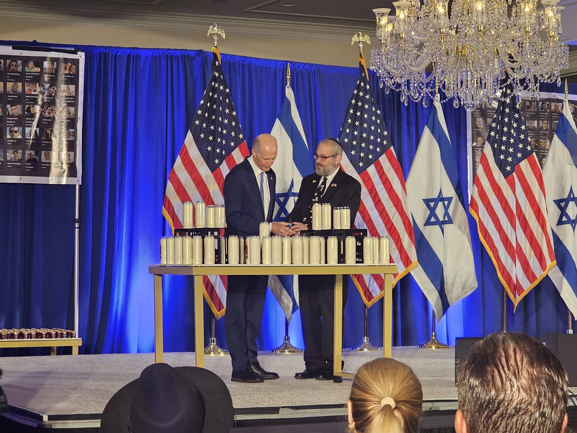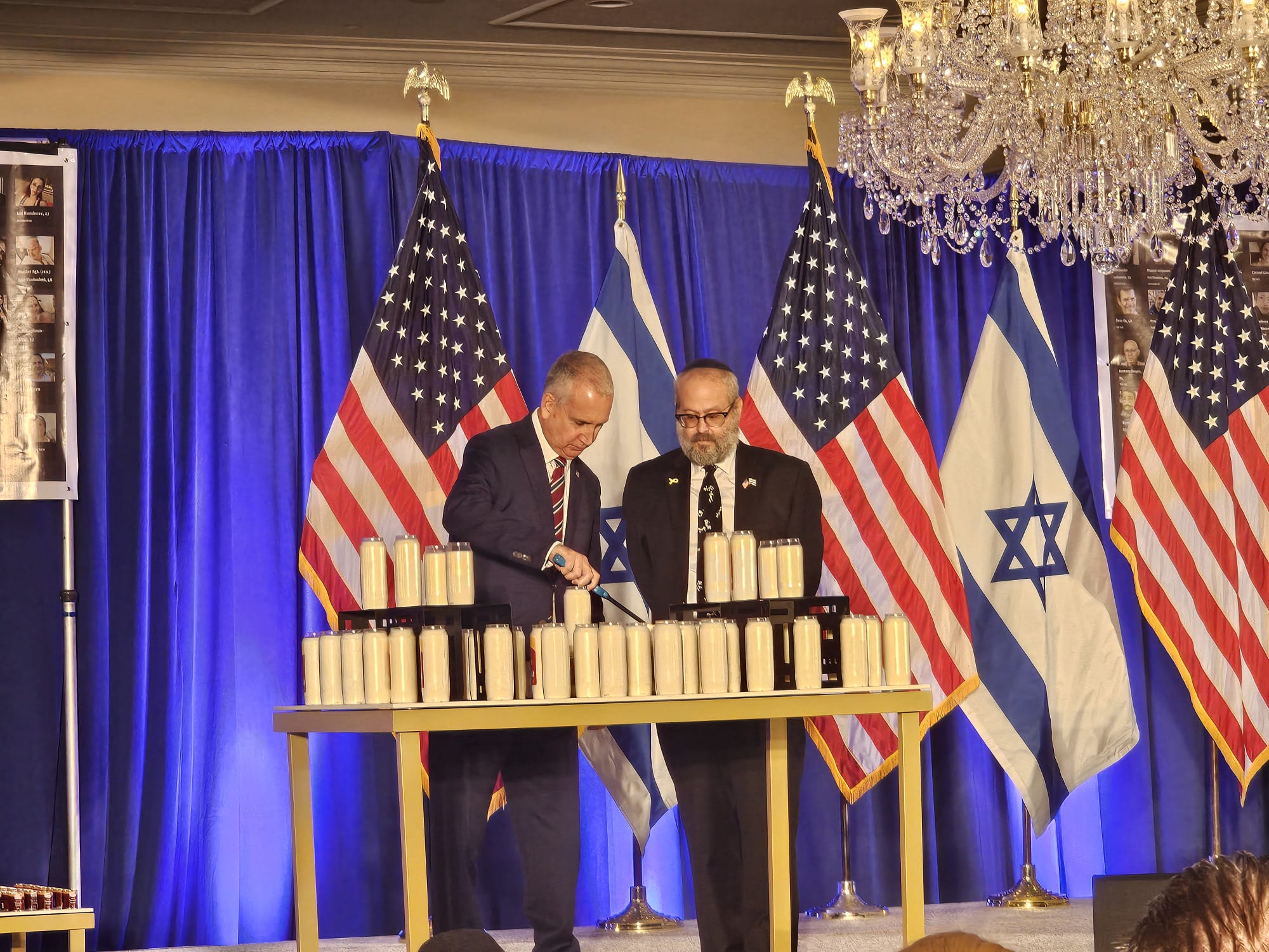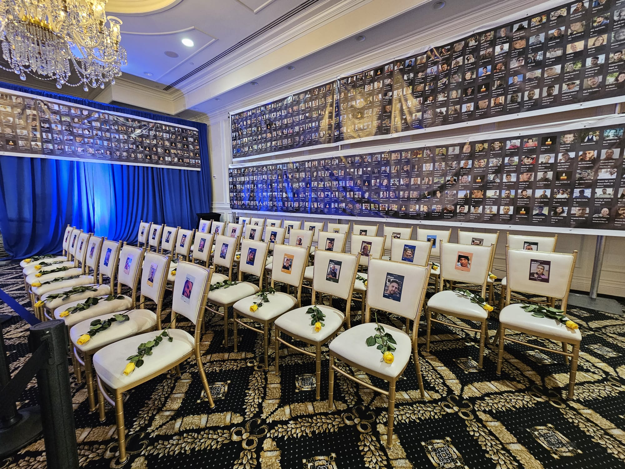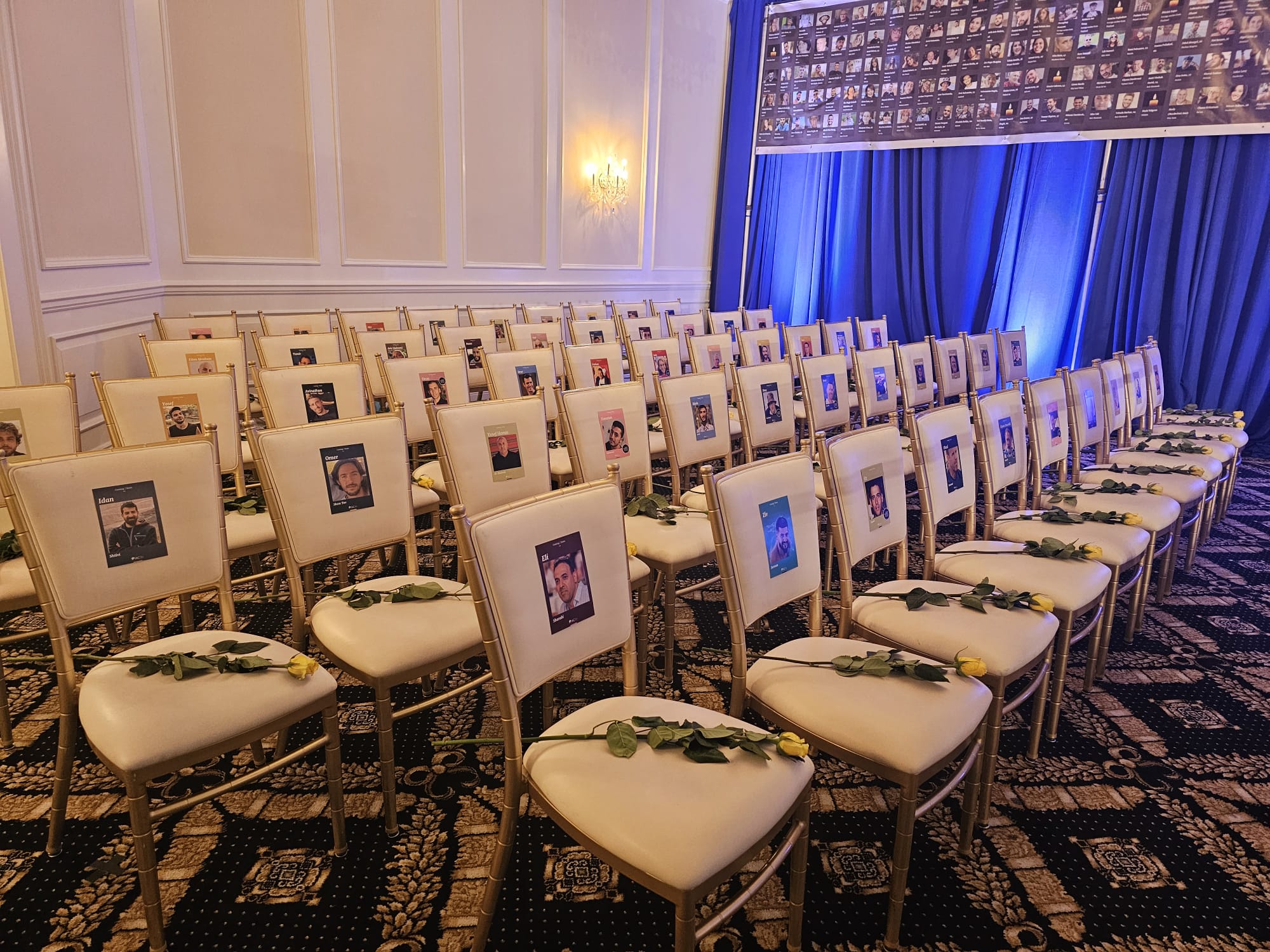 As the ballroom came alive with flickering candles, photos of the dozens of hostages still held in Gaza adorned the walls, serving as haunting reminders of the ongoing crisis. Chillingly, seats were reserved for the hostages, a stark reminder of their plight and the families waiting for their safe return. Images of those murdered by Hamas surrounded by candles brought tears to the eyes of many, with the raw emotional pain inflicted by the October 7 on display a full year later.