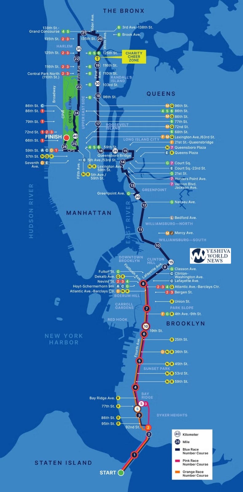The 26.2 marathon route starts in Fort Wadsworth, Staten Island before traveling across the Verrazzano-Narrows Bridge into Brooklyn. The race begins with the professional wheelchair division at 8 a.m., with the final wave of runners taking off at 11:30 a.m.