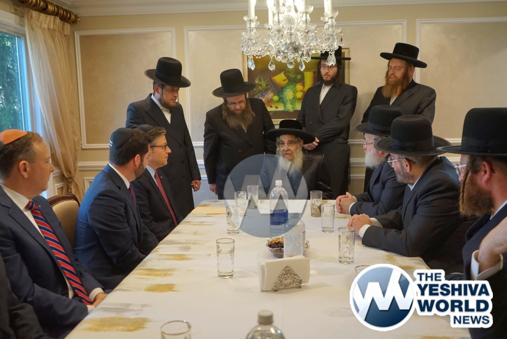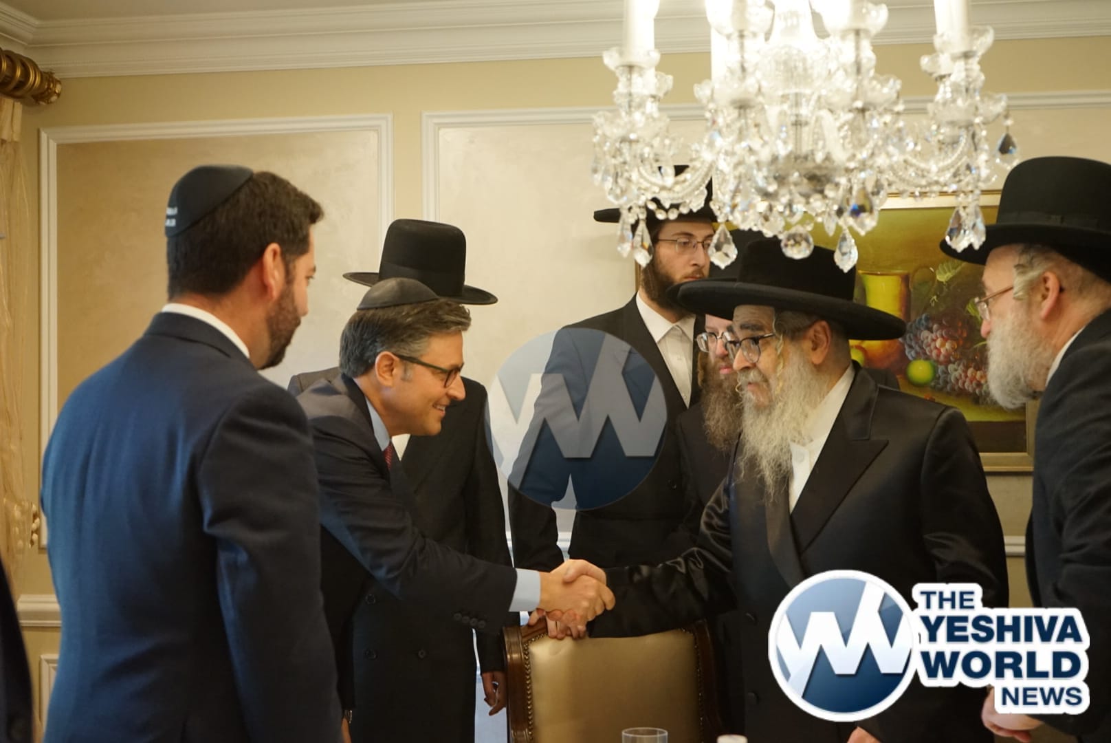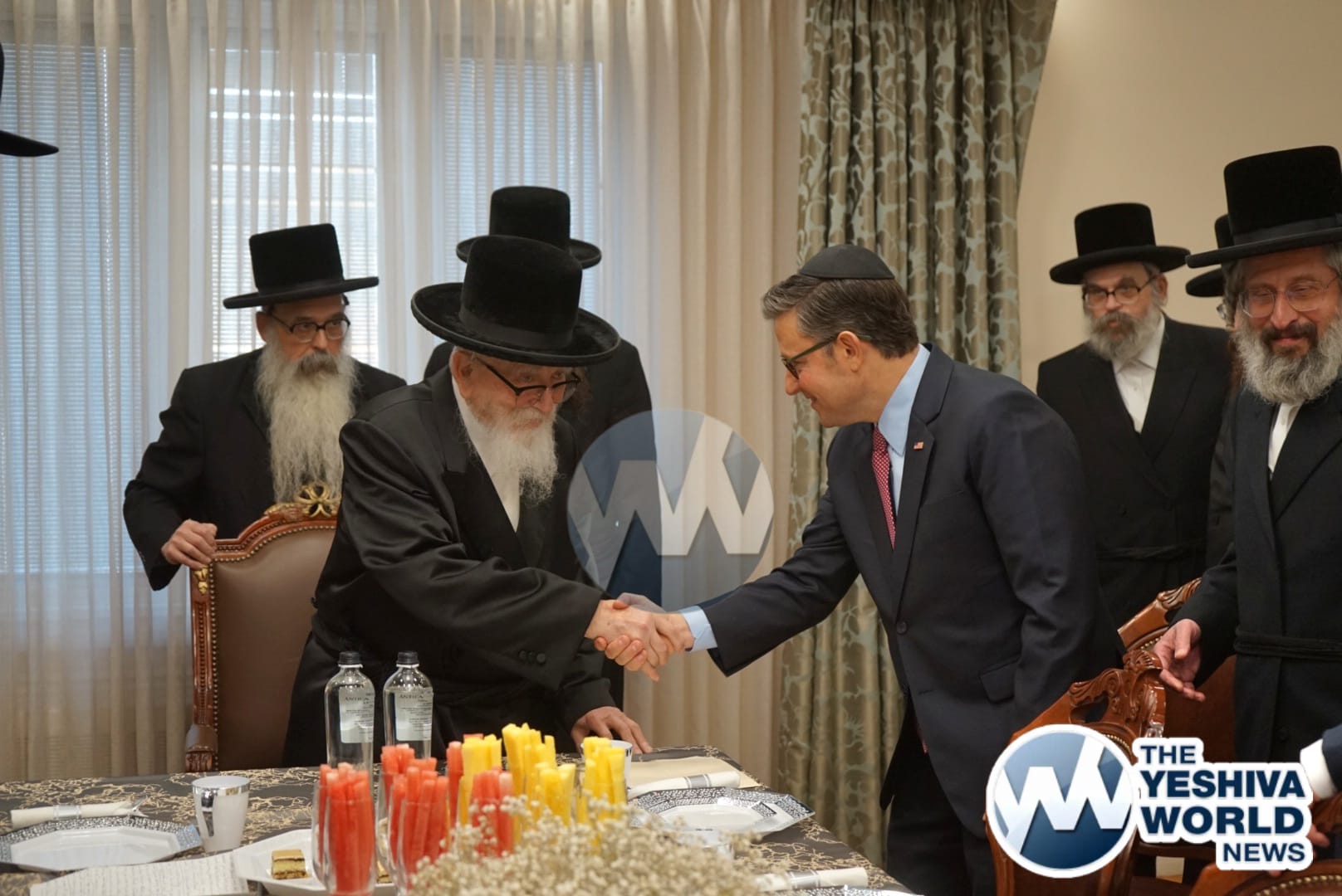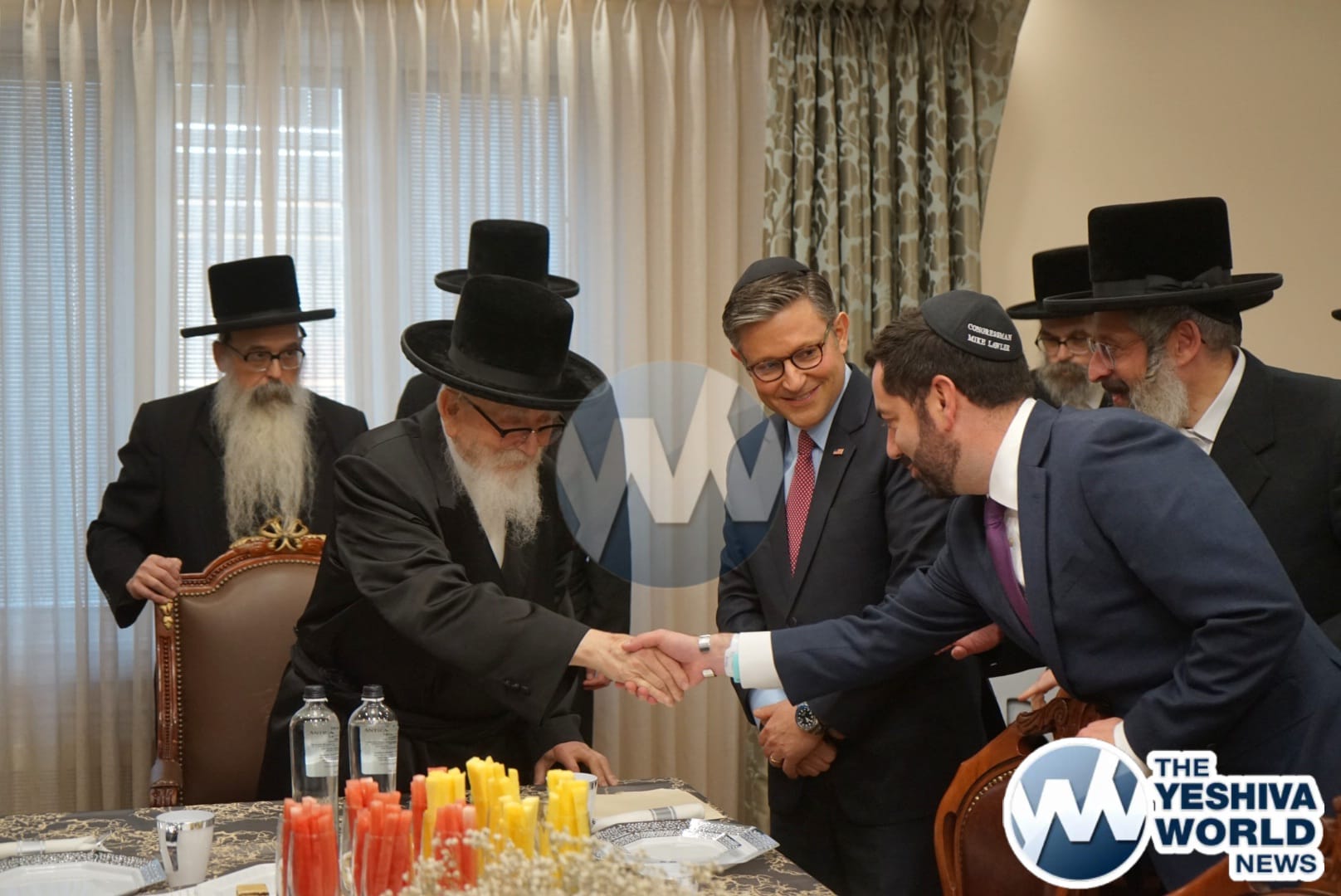 The delegation’s first stop was in Monsey, where they met with the Viznitzer Rebbe. Speaker Johnson then proceeded to meet with the Satmar Rebbe of Kiryas Joel, HaRav Aron Teitelbaum Shlita, who made a special trip to Monsey from Kiryas Joel, greeting the Speaker at his vacation residence.