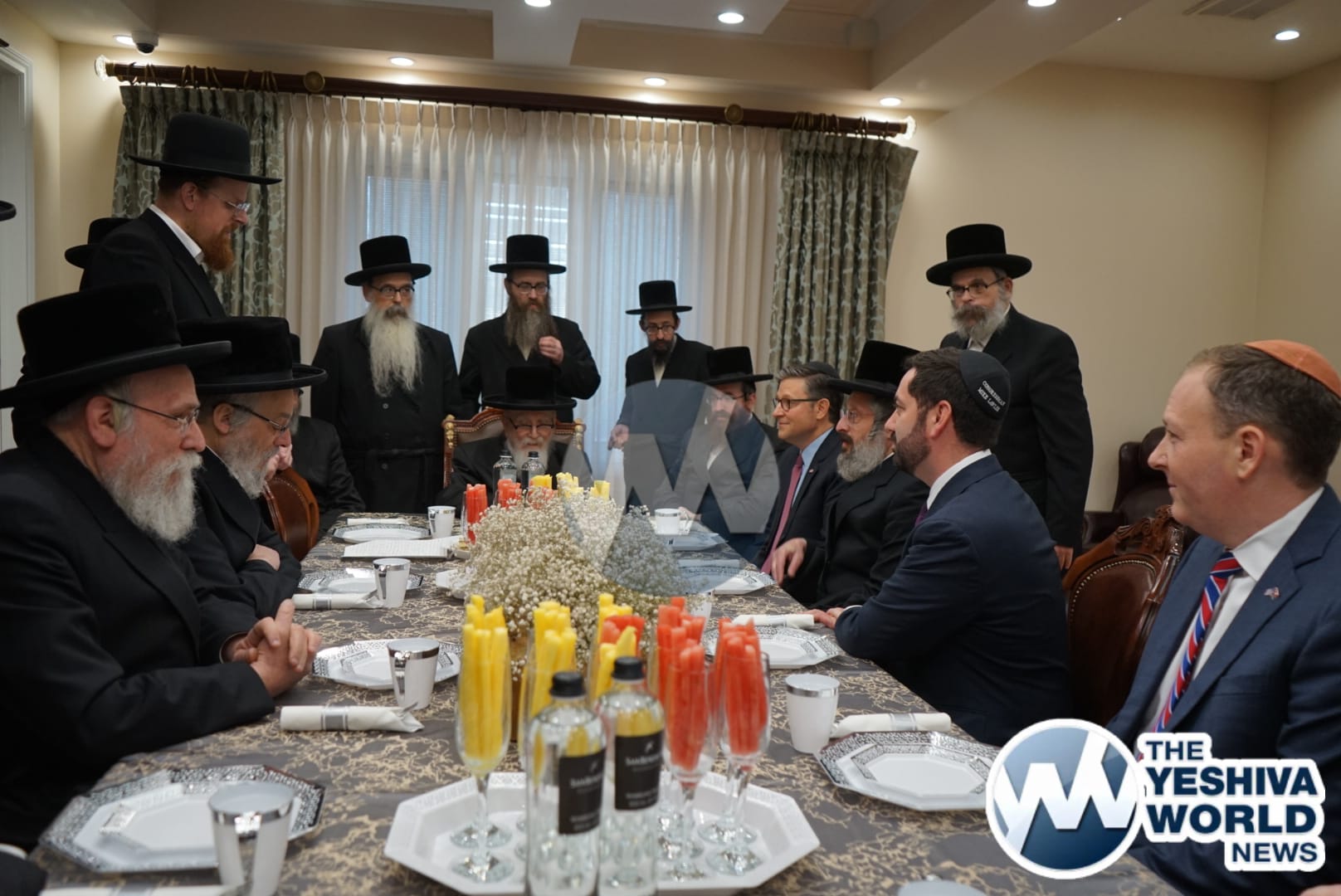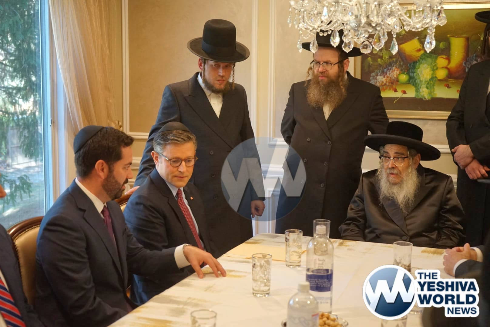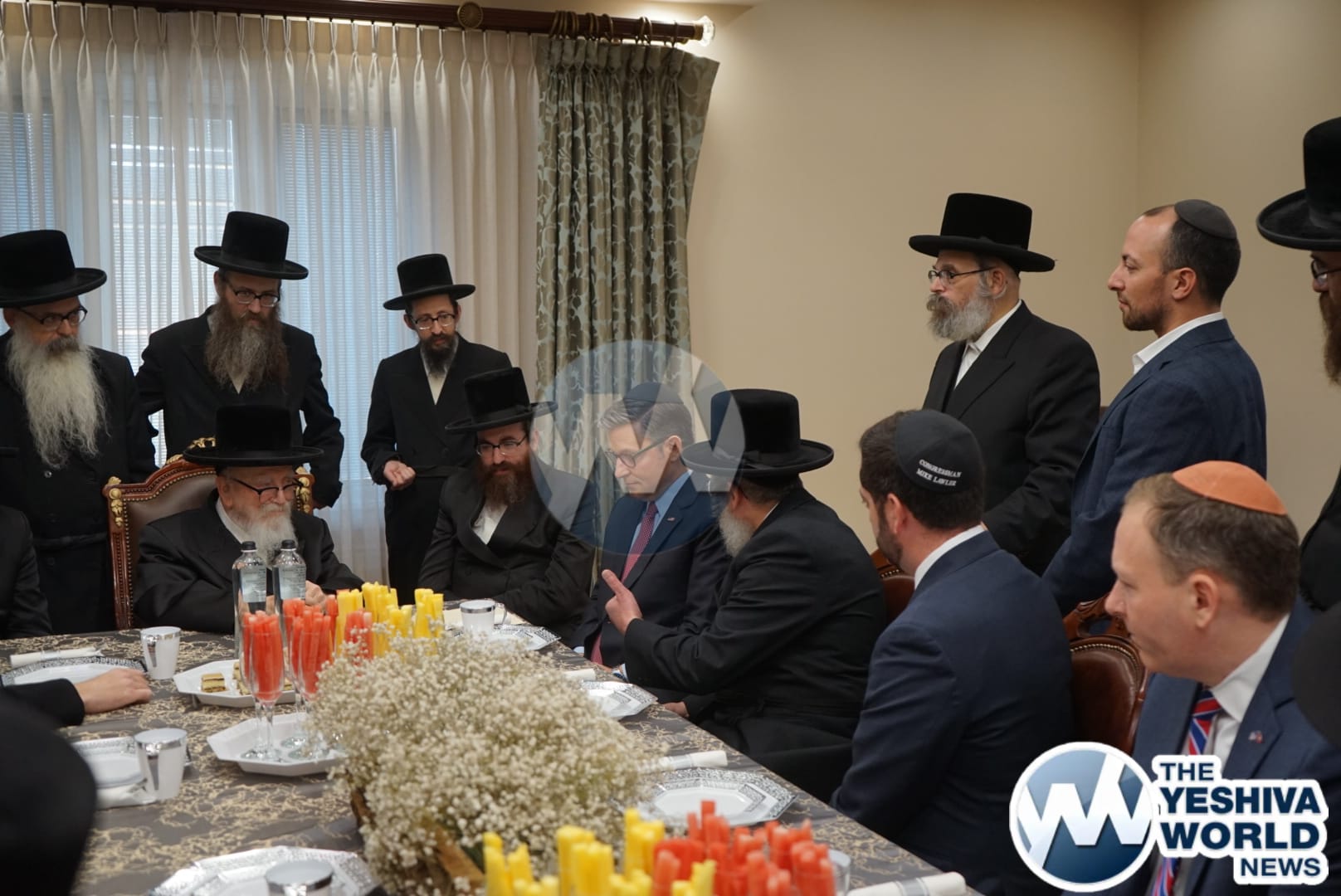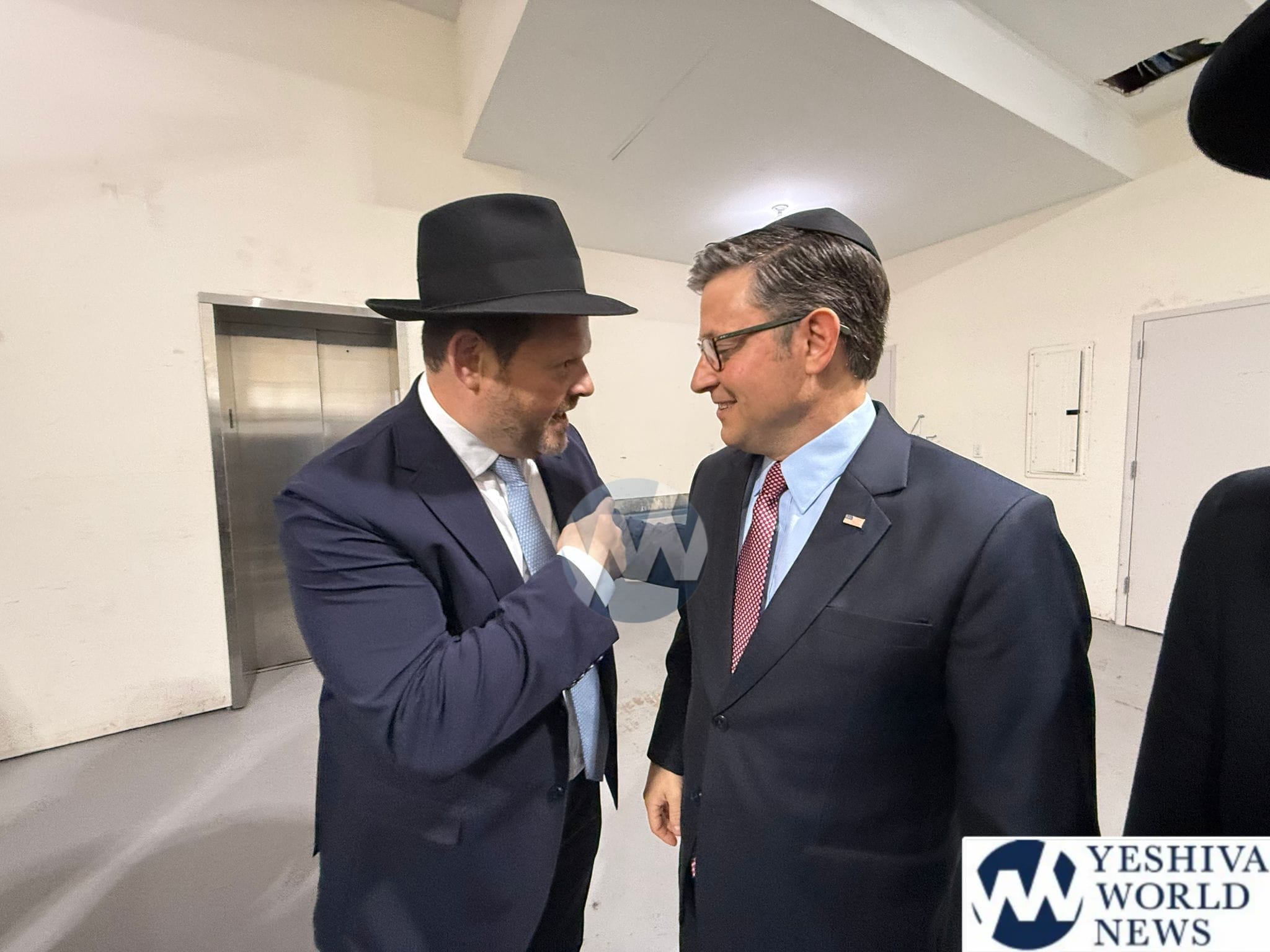 The delegation’s first stop was in Monsey, where they met with the Viznitzer Rebbe. Speaker Johnson then proceeded to meet with the Satmar Rebbe of Kiryas Joel, HaRav Aron Teitelbaum Shlita, who made a special trip to Monsey from Kiryas Joel, greeting the Speaker at his vacation residence.